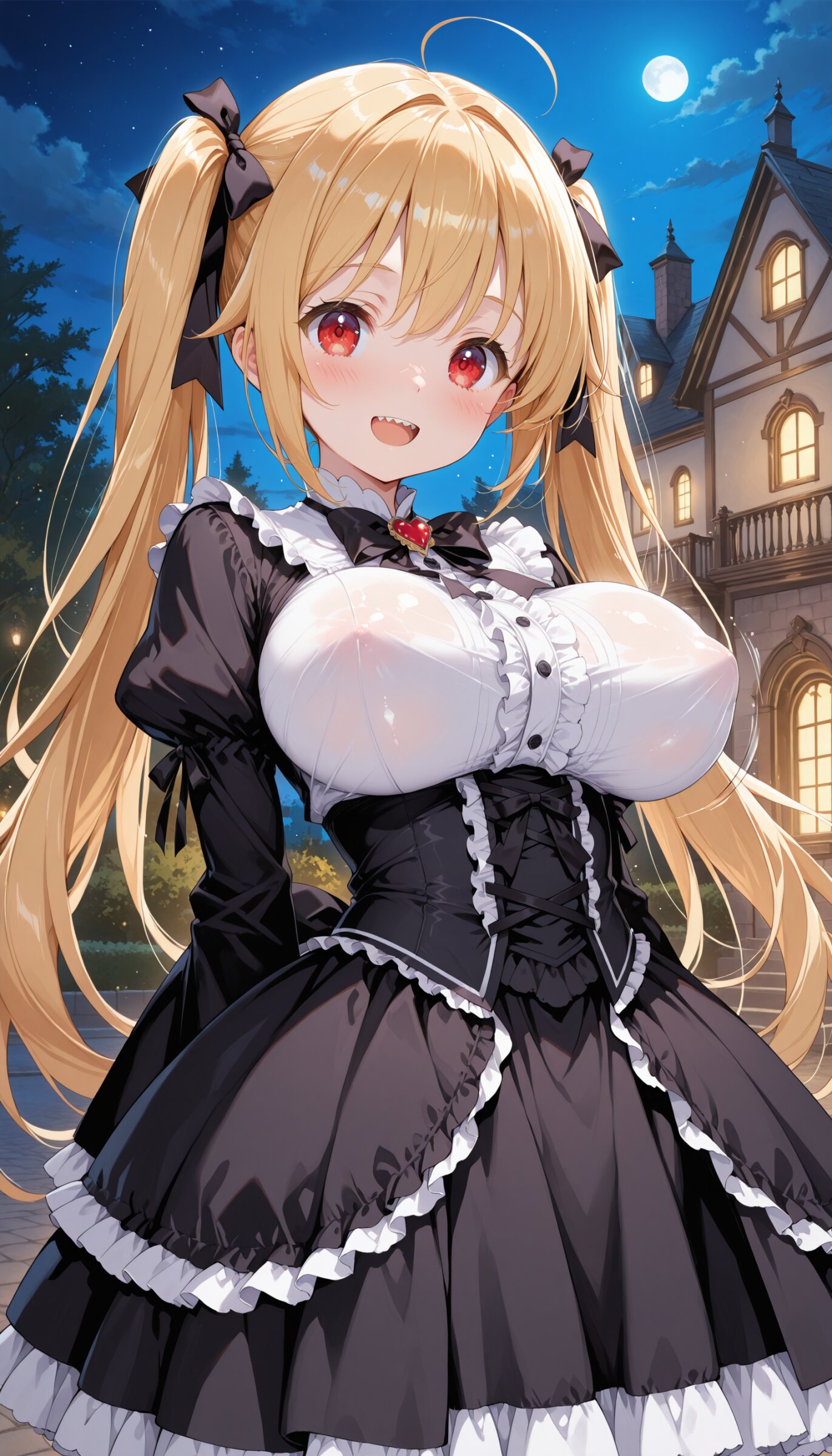 masterpiece,high resolusion,illustration,ultra detailed 8k art,extremely detailed CG,official art,clothes reflecting light,detailed shiny skin,detailed background:1.3),1girl,little girl,Vampire girl,twintail,(6 years old),((loli:1.2)),minimum body,blonde hair,red eyes,double tooth,gothic lolita costume,sexy detailed frill skirt,heart accessory,big breasts,motion_line,(bouncing breasts),suck blood,young man,manor house,night,