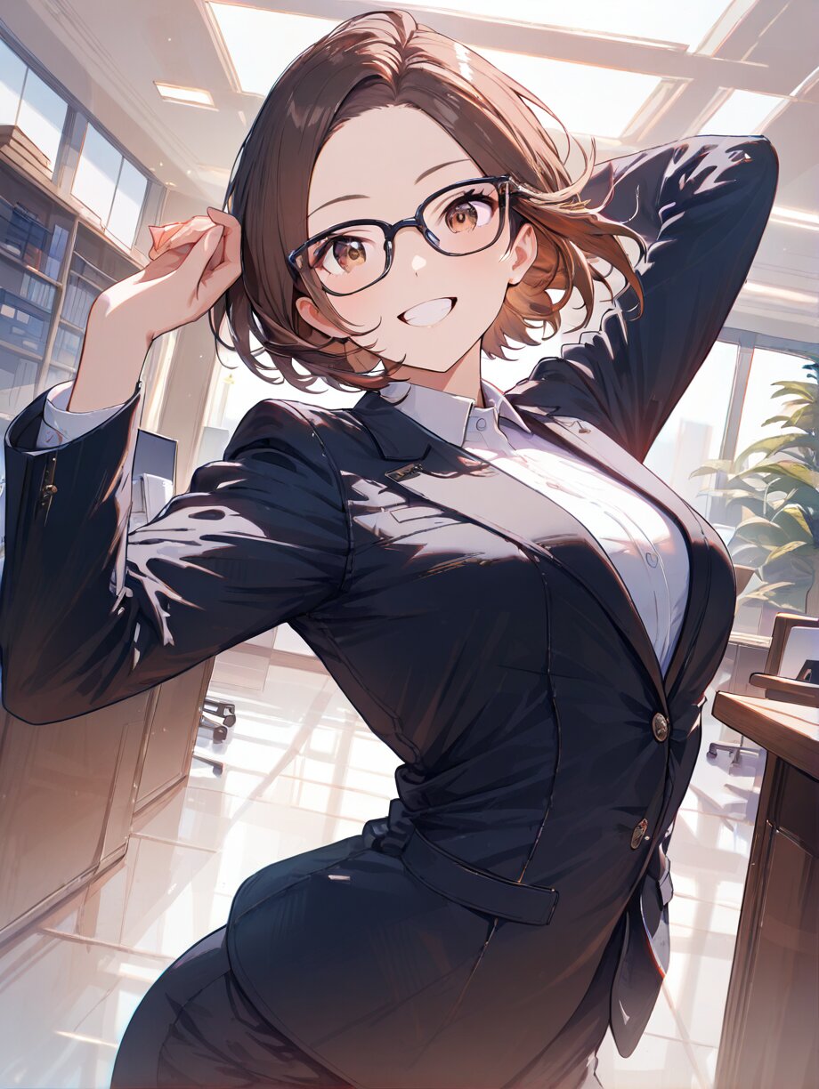 (sharp, 8k, Hires.fix, Ultra Super Fine detailed beautiful illustration), 8k resolution, masterpiece, beautiful highlight, expression eyes, beautiful eyes, solo, forehead, glasses, brown hair, brown eyes, short hair, business suit, office, dynamic angle, dynamic pose, smile, grin, dancing, happy