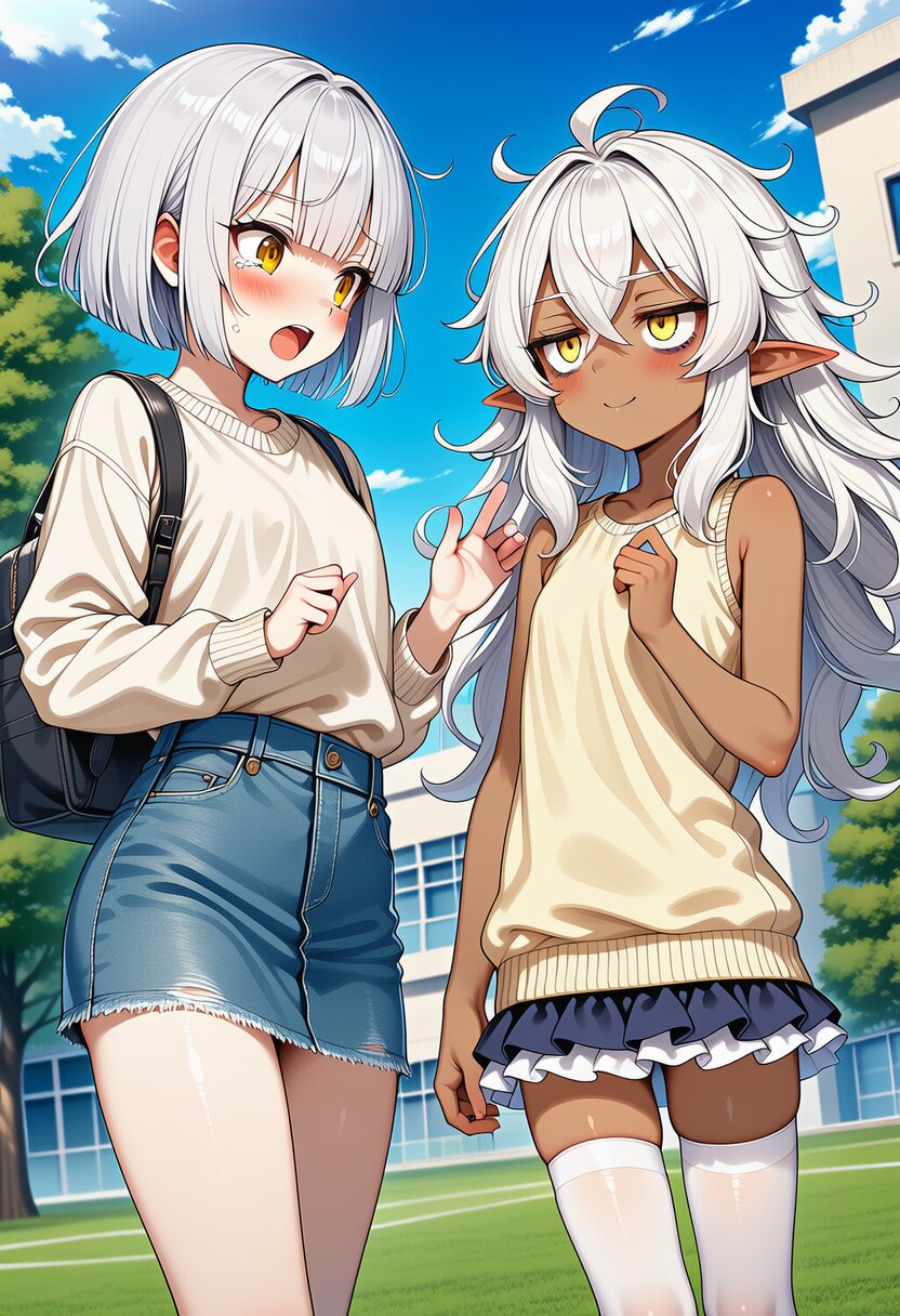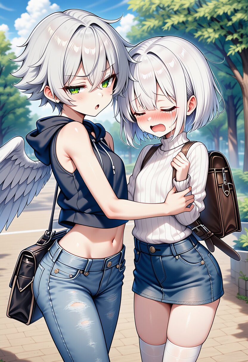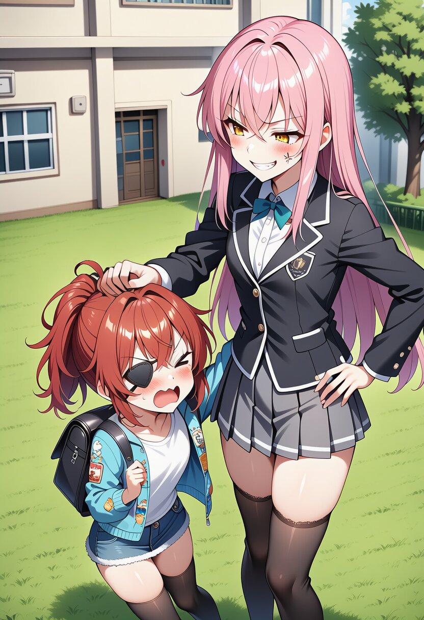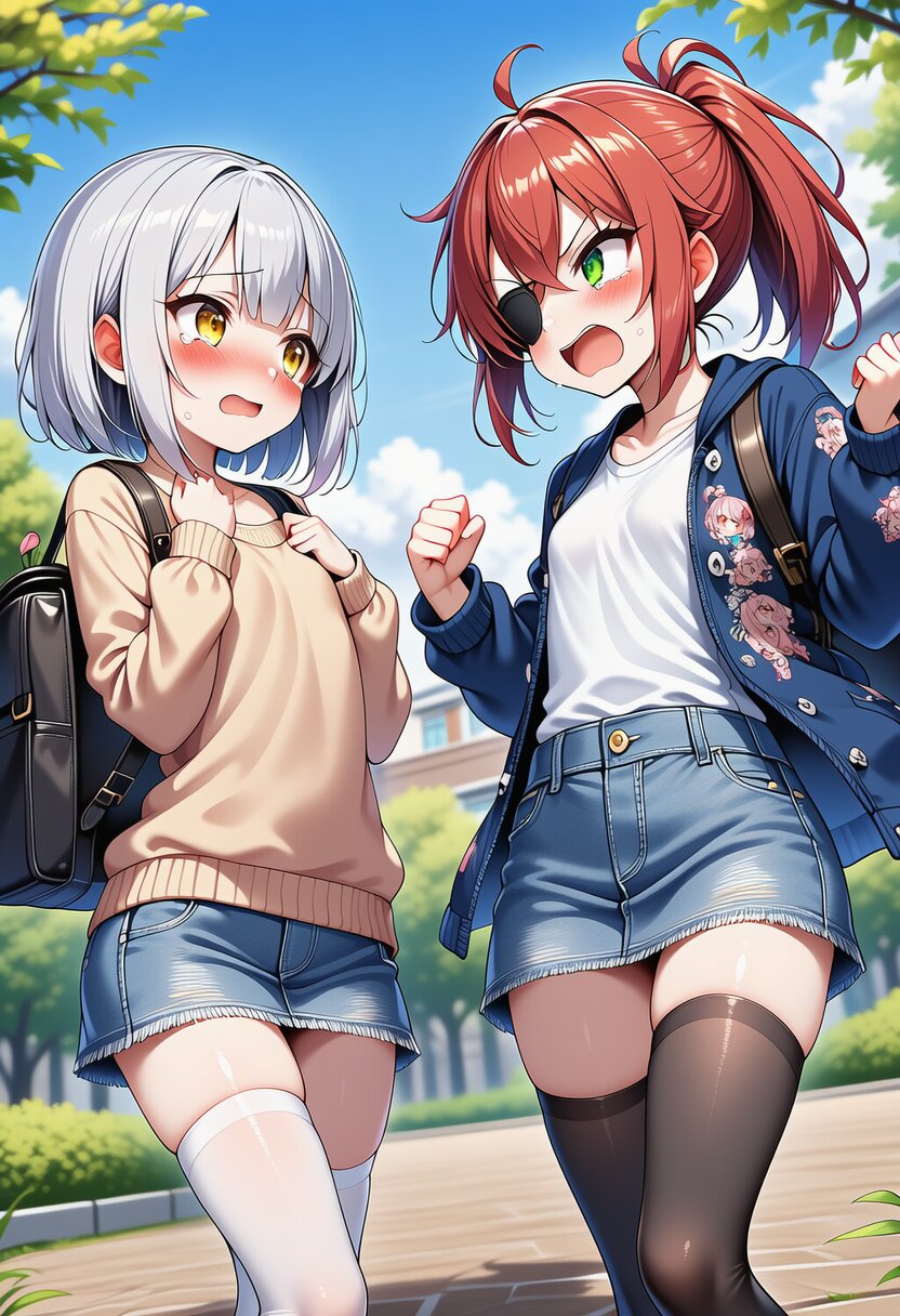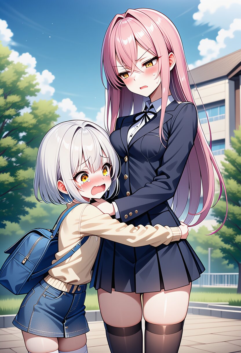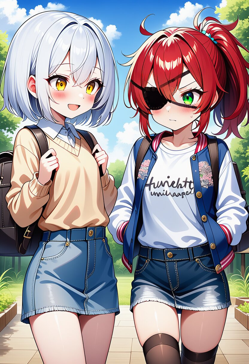ai-generated, year 2024, anime style, 2girls, 1.5::standing side by side::, looking at viewer, midday, outdoor, in school garden, from front, masterpiece, best quality, ultra detailed, perfect finger, 1.0::five finger::, high resolution, absurdres, perfect anotomy, detailed background, unity 8k wallpaper, very aesthetic, masterpiece, no text