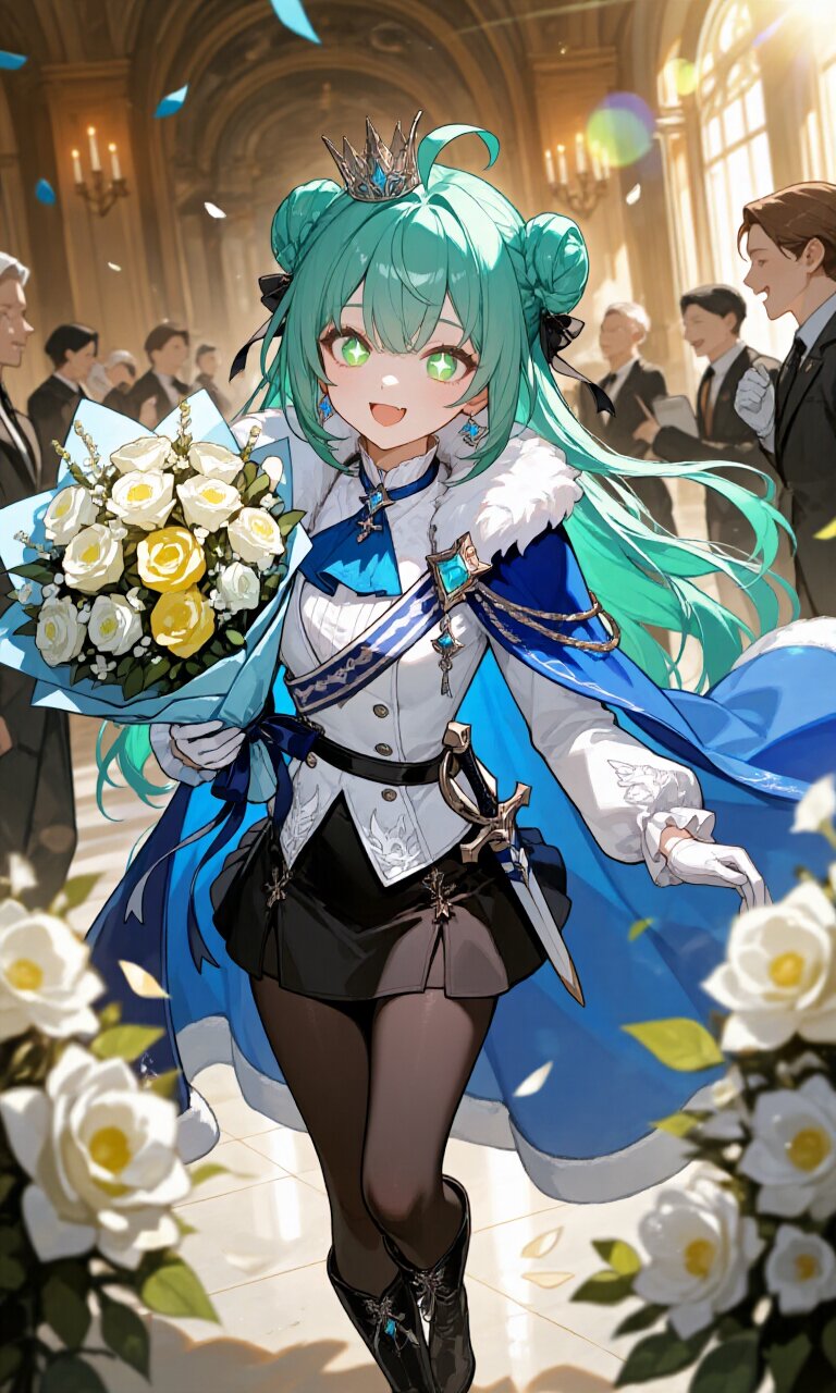 A stunningly beautiful young woman with vibrant (long hair:1.5) styled in double buns with an ahoge, featuring green hair with strands between her sparkling green eyes. Her sparkle-shaped pupils glow with intelligence as she smiles with a visible fang, wearing a hopeful, happy expression. She is dressed in an elegant (white Prince costume:1.5) with (black tights:1.3) and a (blue luxurious Cape:1.3), accessorized with a (black mini skirt:1.3), (black luxurious boots:1.3), and (White gloves:1.2). A (dagger on waist:1.3) and (crown:1.3) complete her princely attire. (Surrounded by friends:1.8) in a grand ballroom with baroque architecture, she stands (holding a bouquet in hand:1.5) amidst (lots of flowers) under shinning light and lens flare, creating a dreamy, romantic academia atmosphere. The hyperrealistic photo emphasizes intricate details—her porcelain skin, the delicate embroidery on her costume, and the soft glow of candlelight reflecting off the marble floors. The scene exudes a light, celebratory mood, as if captured mid-laughter during a luxurious birthday soirée.