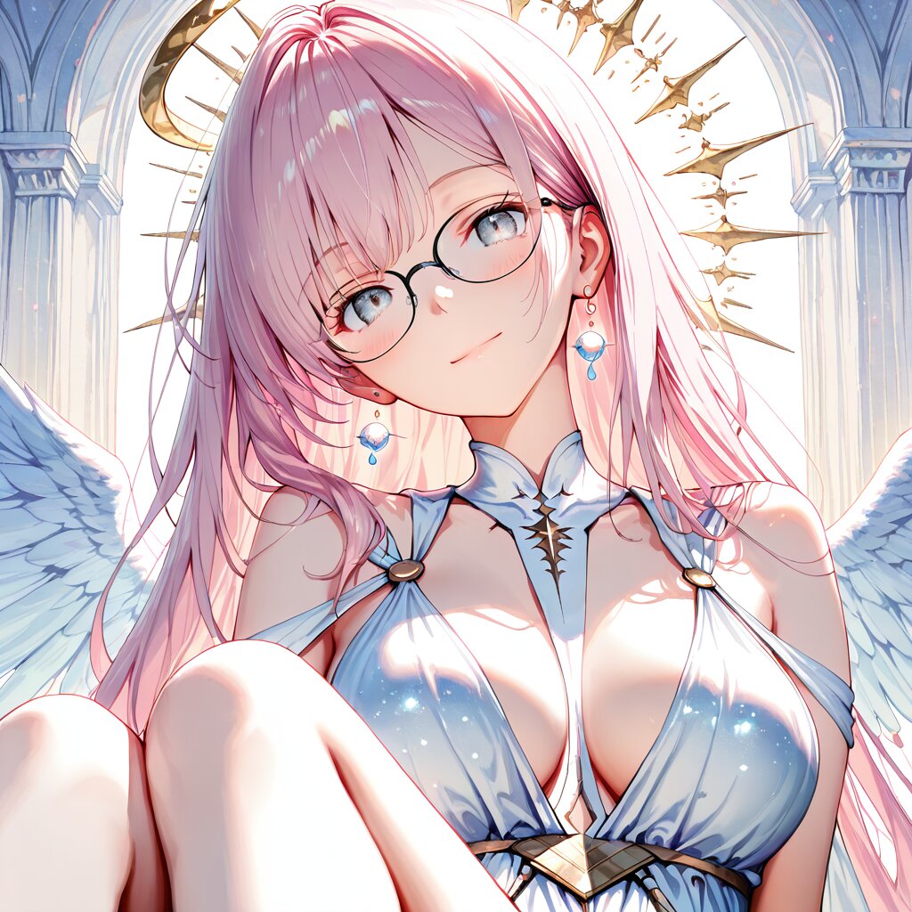 1girl, solo, beautiful female character, angel, wearing glasses, pink long hair, gray droopy eyes, large breasts, upper body shot from knees up, standing with a gentle tilt, relaxed and natural pose, slight smile, elegant flowing dress, grand large detailed wings, soft ethereal lighting, celestial background, watercolor style, pastel colors, soft shadows, delicate expression, highly detailed, ultra-detailed, intricate details, sharp focus, high quality, 8k, masterpiece, best quality, professional illustration, realistic lighting, beautiful composition, realistic anatomy, painterly style