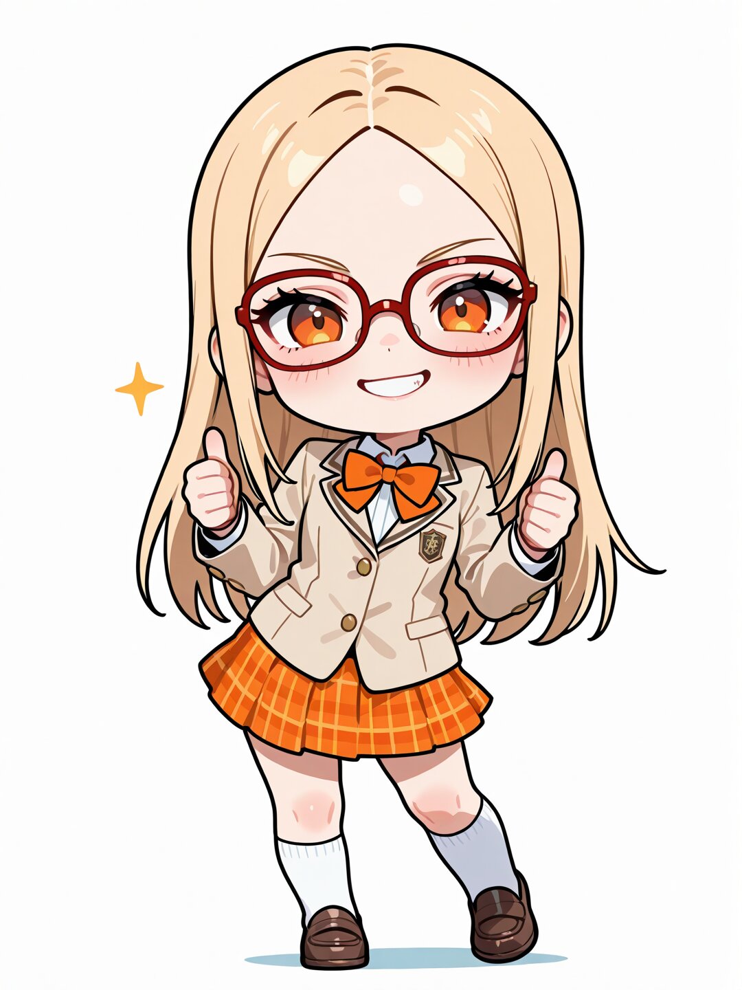 solo,soft anime face, teenage,blonde hair, long hair, calm amber eyes,straight hair,center parted bangs,forehead, delicate face,detailed face,detailed skin,masterpiece,best quality,insanely detailed,beautiful,16k,cheerful,grin,simple white background,school uniform, beige blazer, orange bowtie,plaid orange mini-skirt,knee socks,loafers, contrapposto, making a thumbs up,chibi,deformed,cute,kawaii,glasses,side view