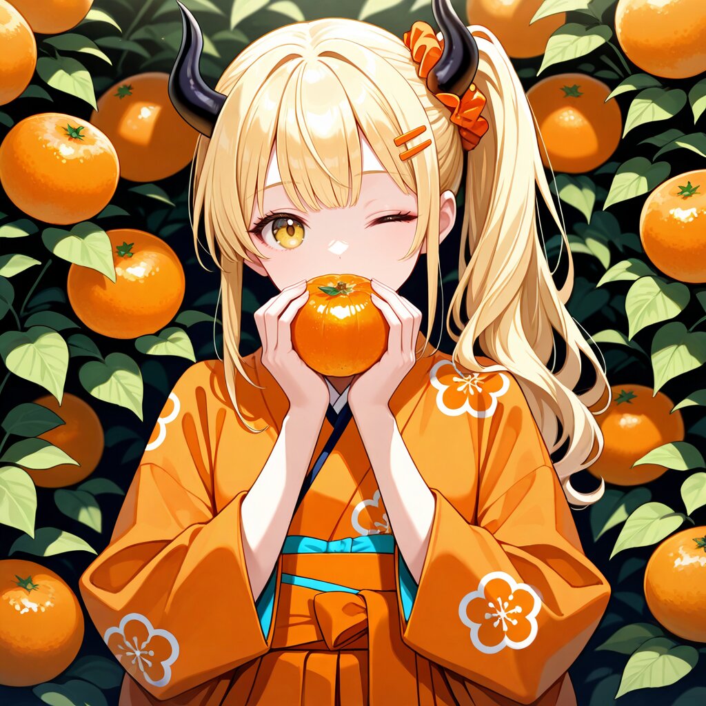 masterpiece,best quality,highres,highly detailed,detailed eyes,general,1girl,solo,17yo,(two demon horns,black horns,one eye closed, ),holding orange \(fruit\) both hands,kiss,demon girl,small breasts,long sleeves,blonde hair,long hair,bangs,side ponytail,hair scrunchie,orange hairclip,yellow eyes,(long orange japanese clothes,orange patterned clothing,orange obi,long orange hakama),slender girl,upper body,orange \(fruit\) background,looking at viewer,