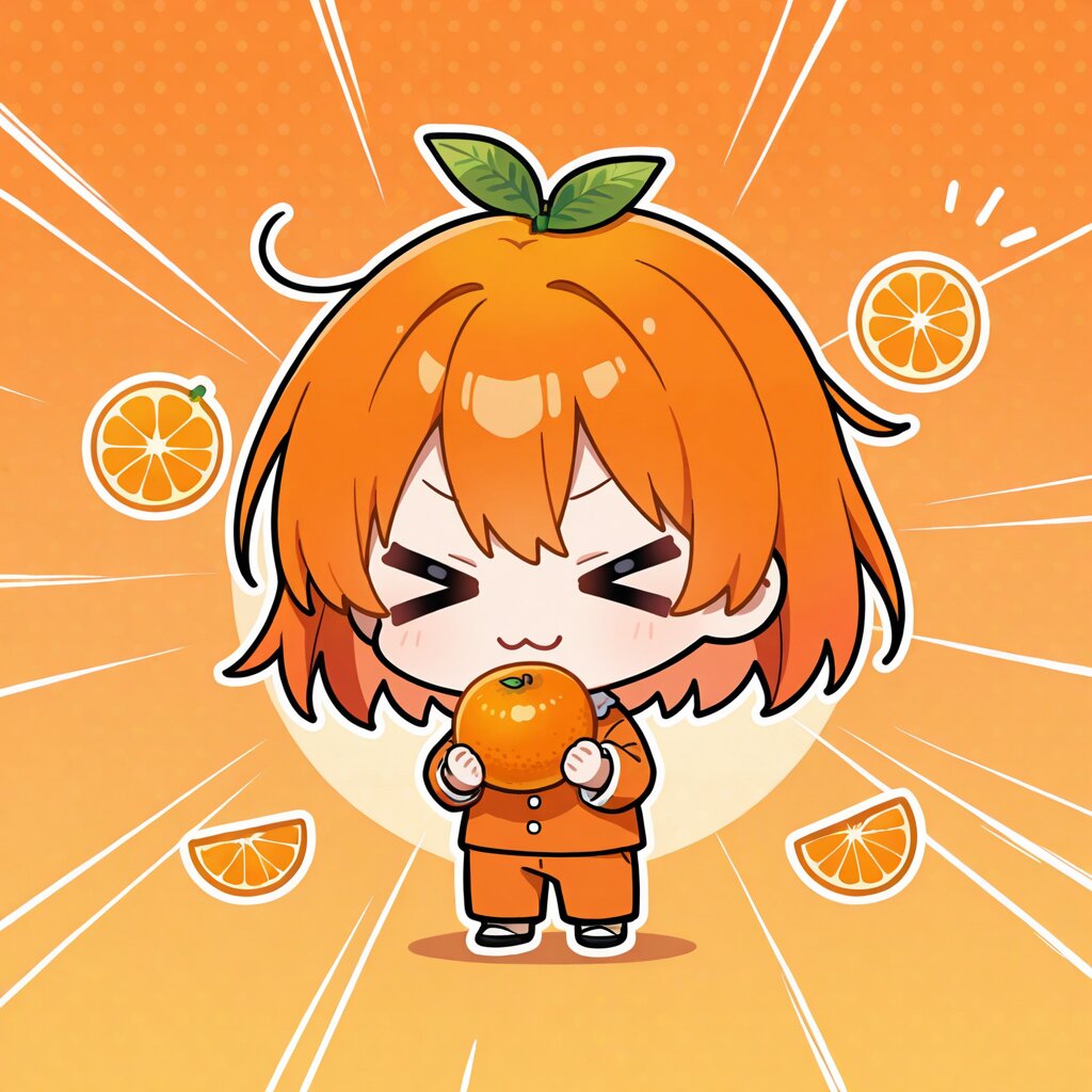 masterpiece,best quality,highres,highly detailed,detailed eyes,general,chibi,1girl,solo,>_<,closed eyes,orange hair,orange blouse,long orange pants,holding orange \(fruit\),orange \(fruit\) background,