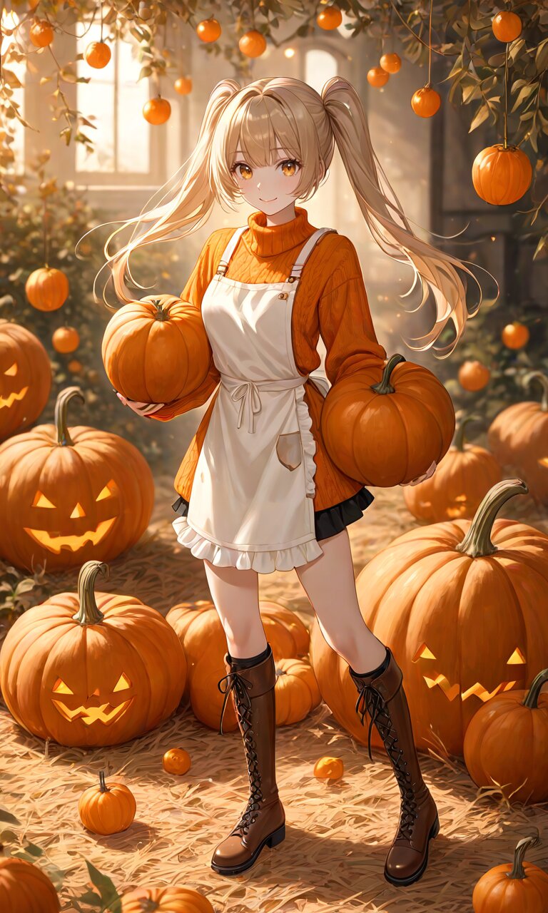 黄金色の畑でカボチャに囲まれて、最高の笑顔と収穫の喜びを独り占め。