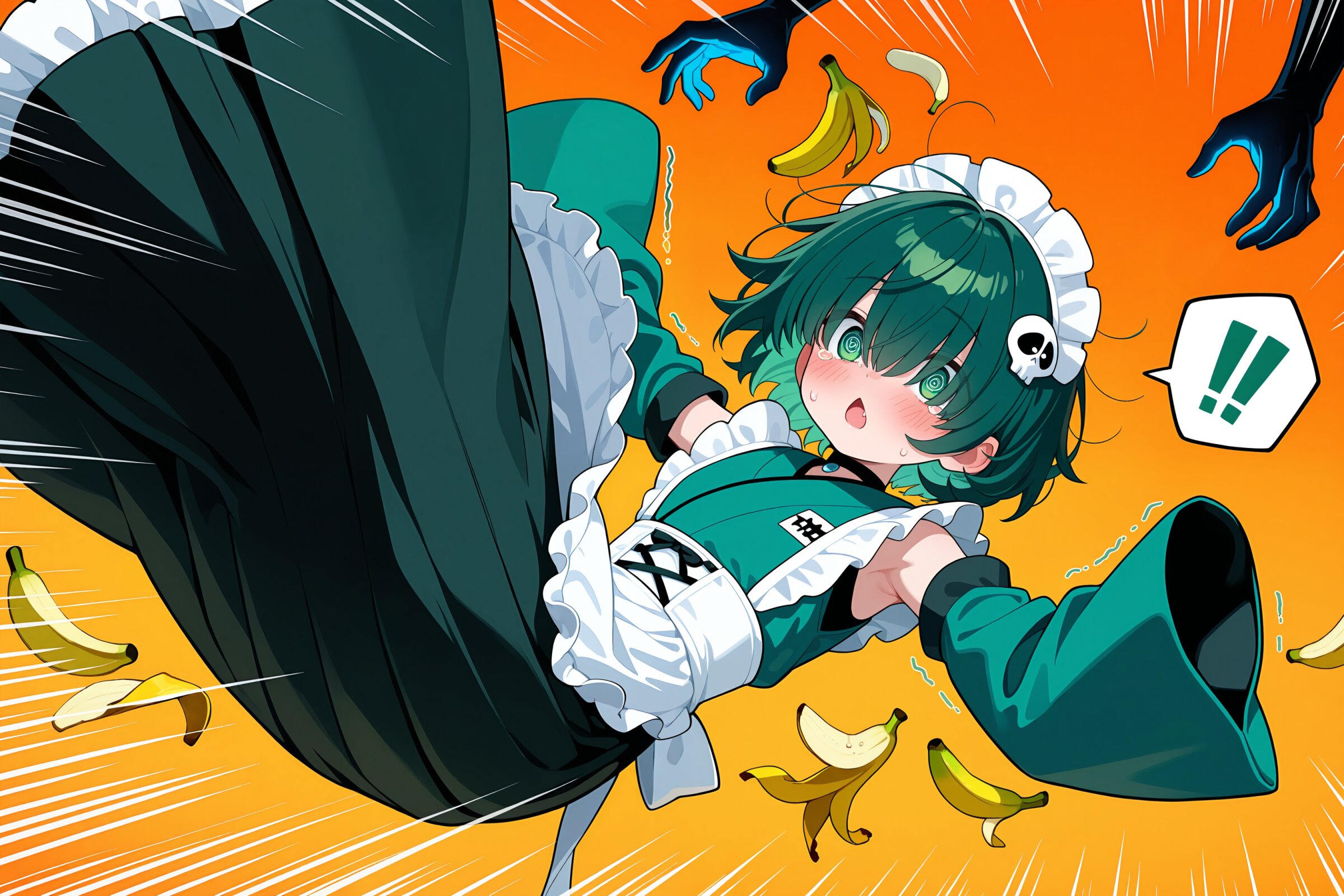 1 little girl, solo, diagonal angle, masterpiece, best quality, amazing quality, very aesthetic, cobalt green hair, short hair, messy hair, (hair over eyes:1.2), green eyes, demon fangs, @_@, chestnut mouth, confused, blush, tearful, spoken exclamation mark, trembling, sweat, choker, green wa maid outfit, (oversized sleeves:1.2), detached sleeves, (floating black ghosty hands:1.2), skull hair ornament, long skirt, slipping, banana peel, motion lines, speed lines, motion blur, somersault, carrying treasure chest on her back, autumn,