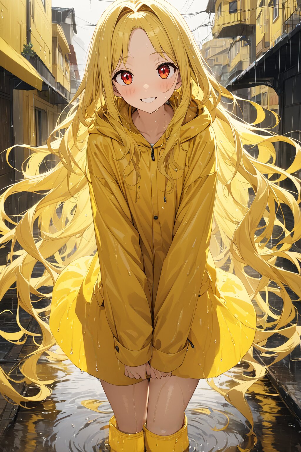 1girl, (yellow theme),(heavy rain),outdoor,puddle,yellow town, (tall:1.3),(young),slender, flat chest, (lemon yellow hair),absurdly long hair,(center parted bangs),(hair intakes:1.3),wavy hair,sideburns, (garnet red eyes),Jig eyes,(tsurime), blush,sneer,smile,joy, yellow long raincoat,yellow boots,(wet), cowboy shot,dynamic angle,looking at viewer, ((best quality)),((very high resolution)),full color,((ultra detailed)),extremely detailed CG,super fine illustration, perfect anatomy,perfect hands,super detailed skin, (beautiful eyes,detailed eyes,clear eyes,perfect eyes),high-quality face,extremely detailed face, manga style,