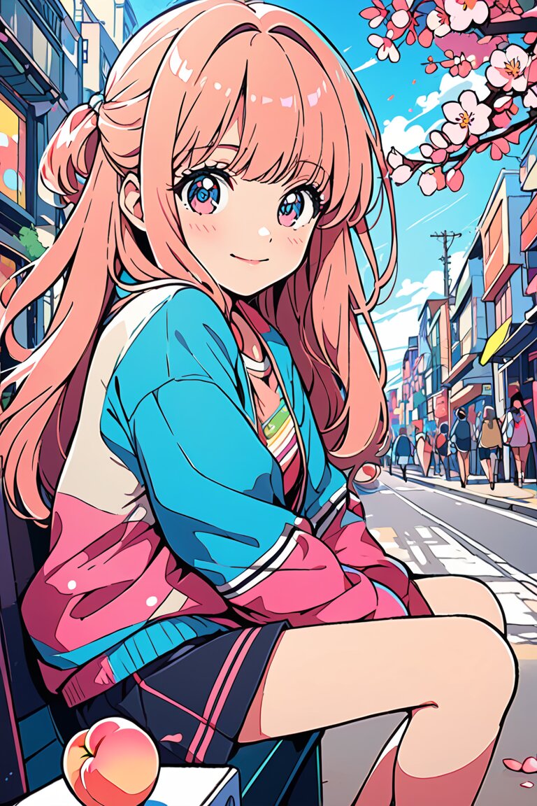 masterpiece, best quality, beautiful detailed eyes, ultra-detailed, finely detail, highres, vivid colors, kawaii illustration, retro style, Kyoto Animation, multicolor pastel city pop illustration, 1 girl, solo, ((peach blossom:1.5)), image captures the cheerful and colorful style of city pop illustration, urban vibe of city pop illustration, (Primary color painting), city pop art girl, city pop painting illustration, 90s fashion, 90s anime, sky, Japanese city pop illustration, sitting, flat color, (hill), (sitting on the hill)
