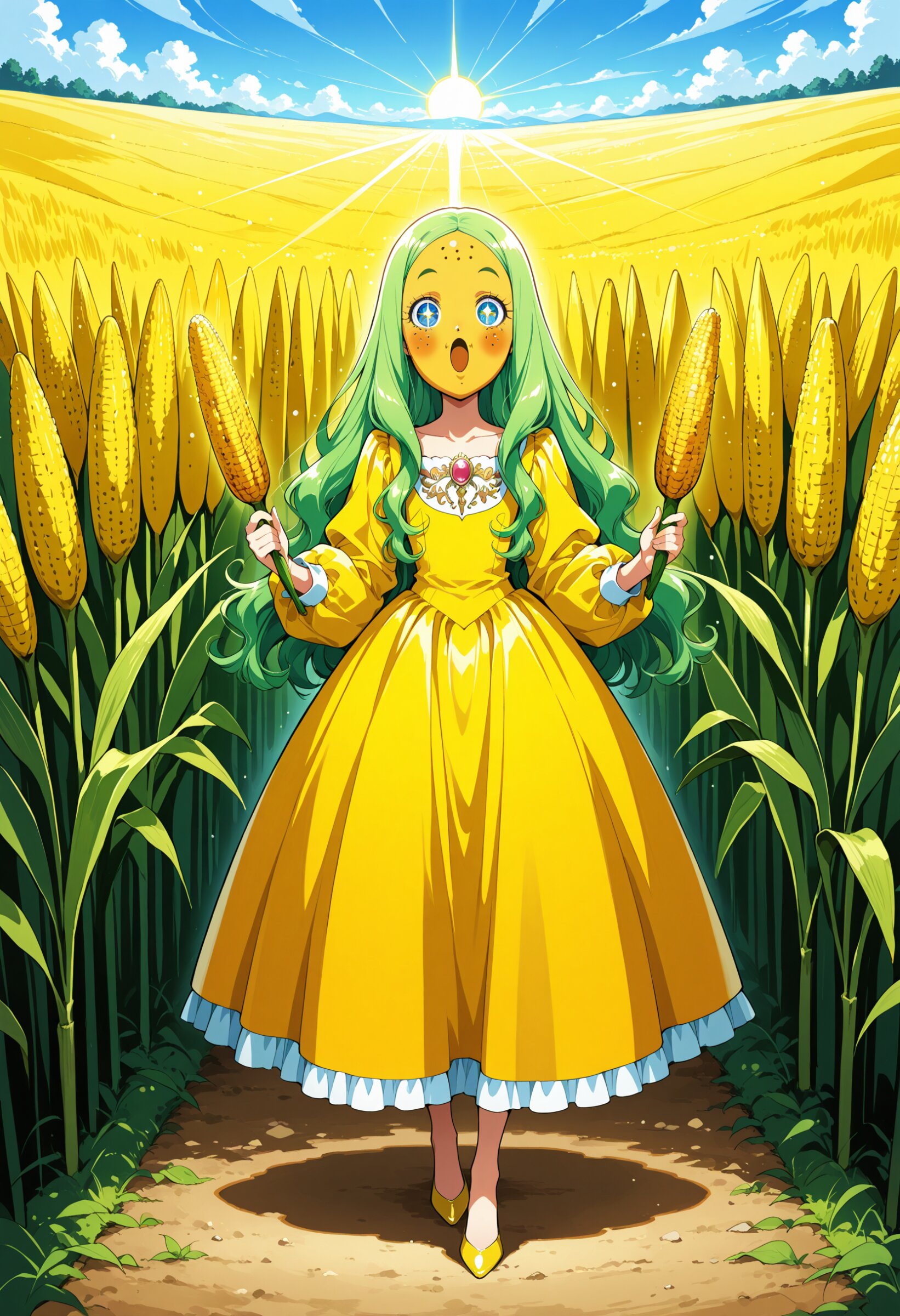 トウモロコシのキャラクターとひまわり畑を背景にした女の子を作りました。