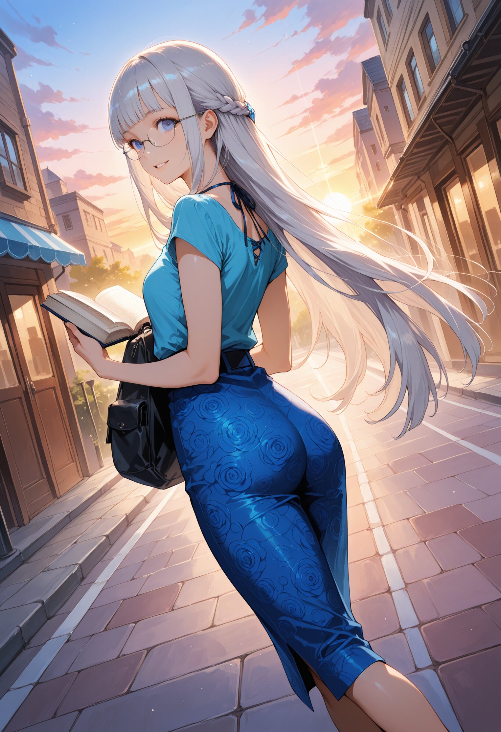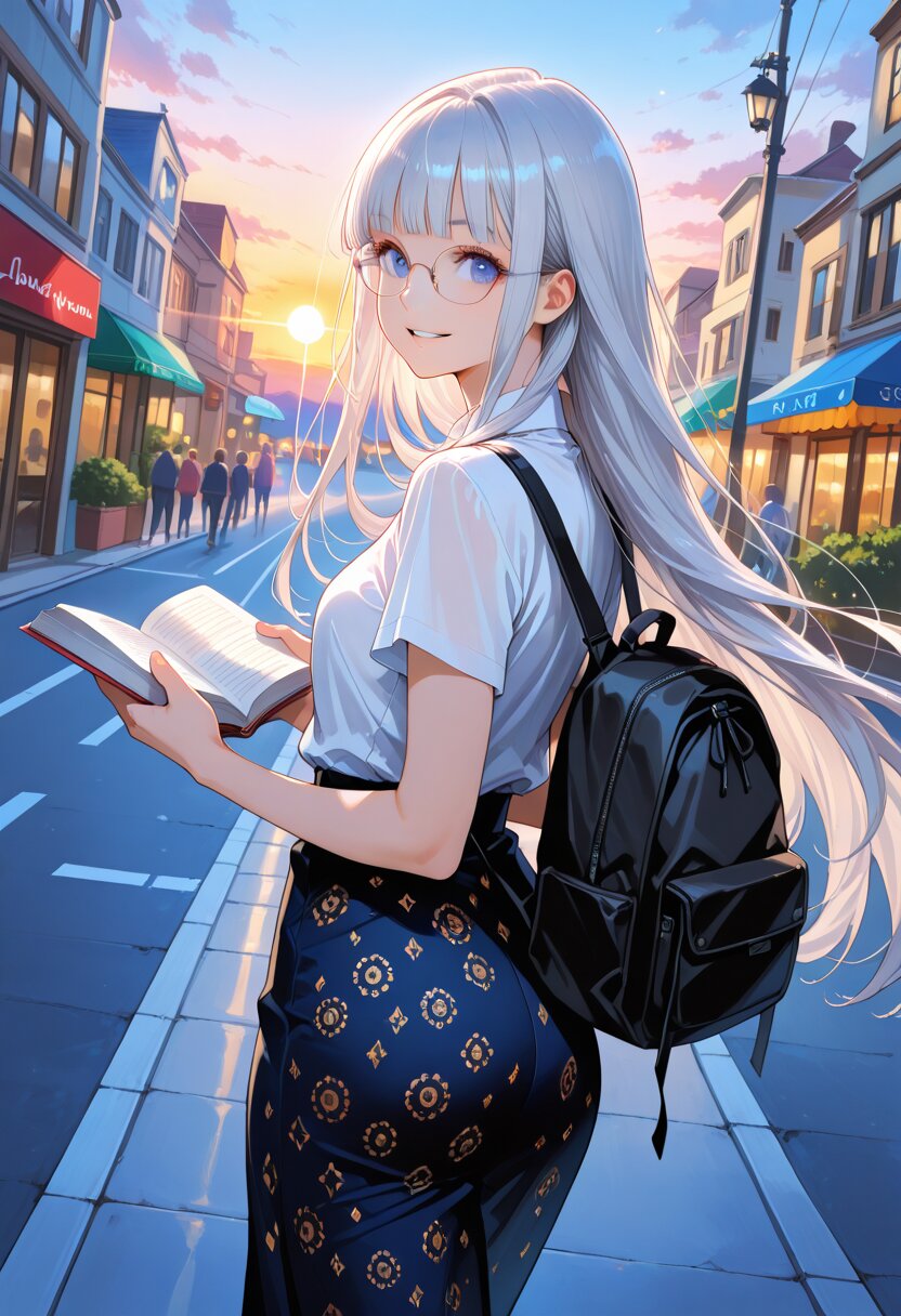 (rating: sensitive:1.2), score_9, score_8_up, score_7_up, score_6_up, NSFW, source_anime, (delicate illustration), (watercolor style illustration, flat colors, bleed watercolor effect), 1girl with glasses reading a book, rucksack, walking down street, very long hair, silver hair, blunt bangs, short sleeves, sunrise, dawn, looking back, from side above, (fashion illustration, elegant, ultra-intricate detailed), flat design, bold colors, patterned fabric, BREAK insanely beautiful and detailed clothes, beautiful small face, big round eyes, beautiful detailed eyes, long eyelashes, double eyelids, parted lips, smile, kawaii, cute, (flat chest, covered nipples:0.4), slender, perfect anatomy, (dynamic angle, dynamic pose), BREAK (DOF), sharp focus on the girl, emphasizing depth, BREAK (masterpiece, aesthetic quality, 8K, ultra-detailed), (perfect design, realistic complex), absurdres, highres, (hyperrealistic, photorealistic:1.5), cinematic lighting,
