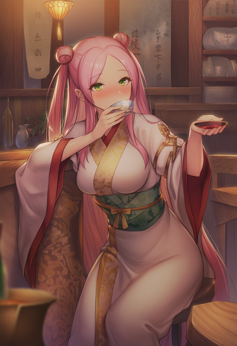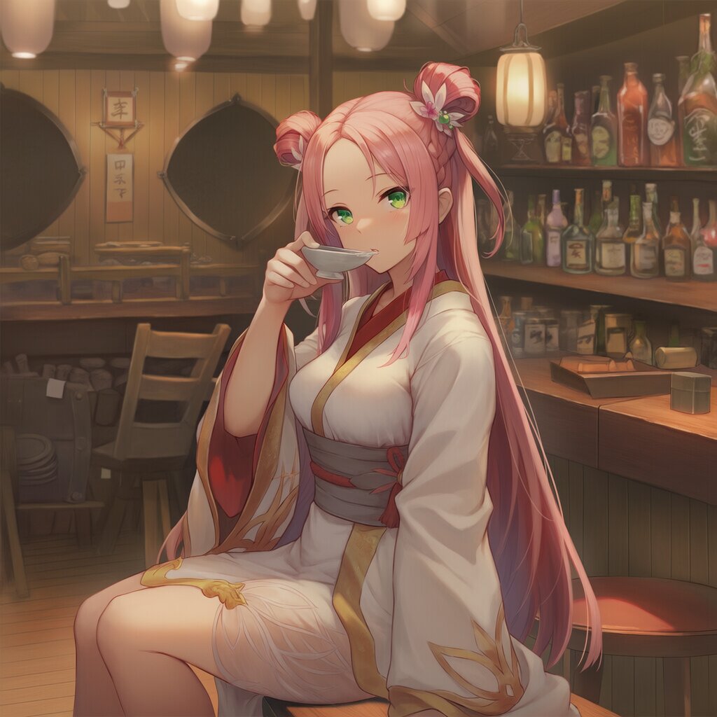 {{{highly detailed}}}, {{official style}}, {{game cg}}, {{intricate}}, {{{detailed beautiful eyes, detailed beautiful face, detailed beautiful face and eyes}}}, 1girl, solo, green eyes, very long heir, {{{straight hair}}}, pink hair, forehead, {{hair bun, two side up}}, medium breasts, {{{white kimono}}}, {{{ancient chinese costumes}}}, {{fairy}}, {{sake, sake drinking}}, cowboy shot, sitting, japanese bar, chairs, desks, {{{masterpiece}}}, {{{best quality}}}, {{{very aesthetic}}}, {{{ultra-detailed}}}, {illustration}, {{{extremely detailed}}}, {{{an extremely delicate and beautiful}}}