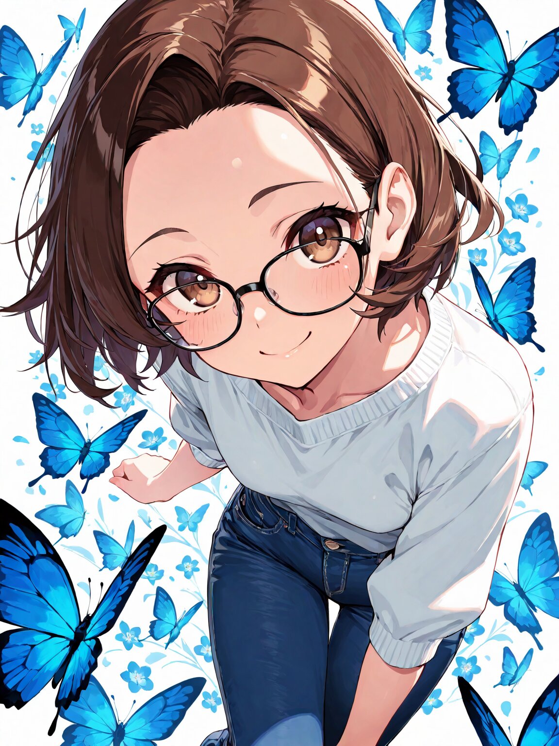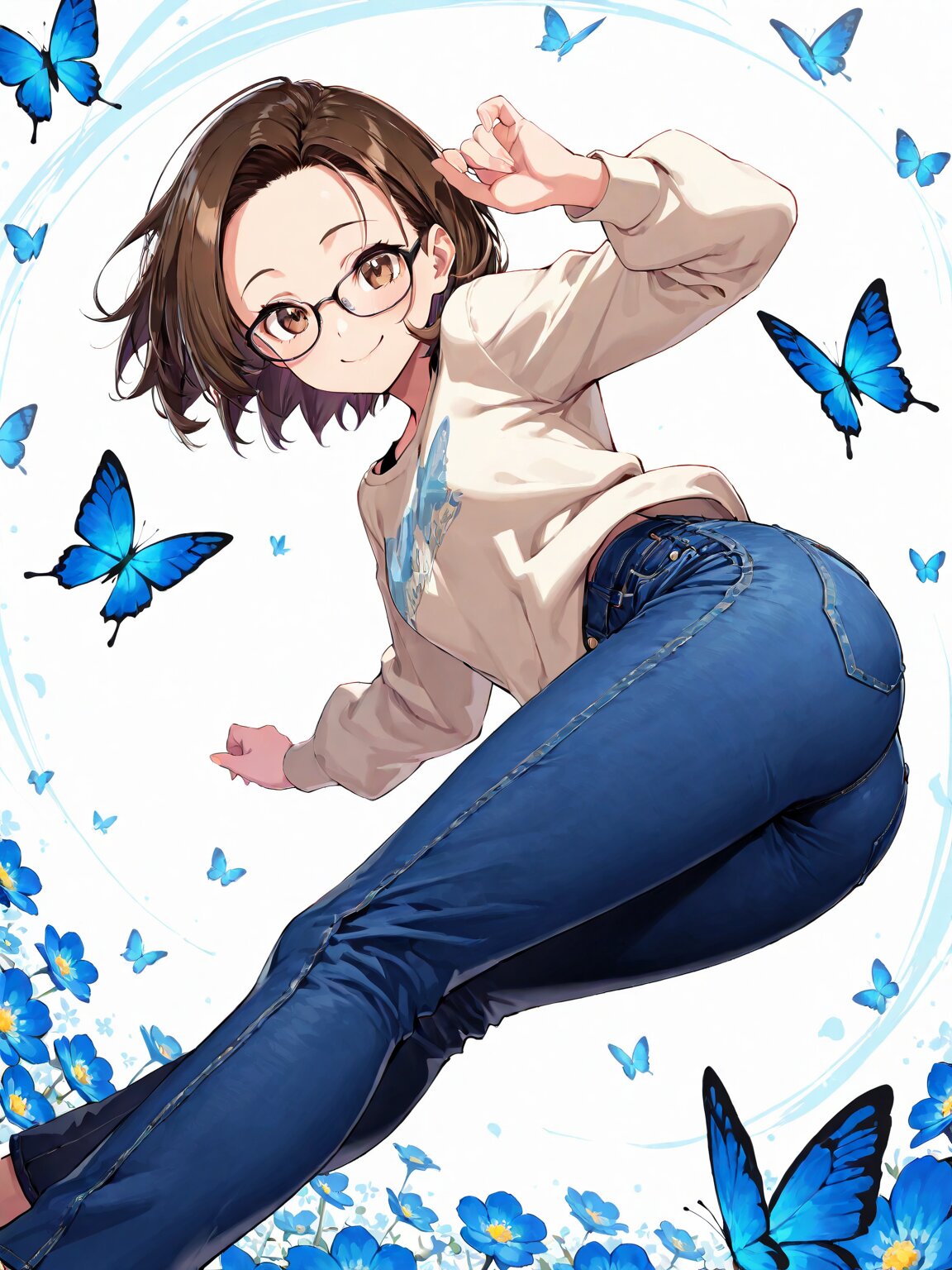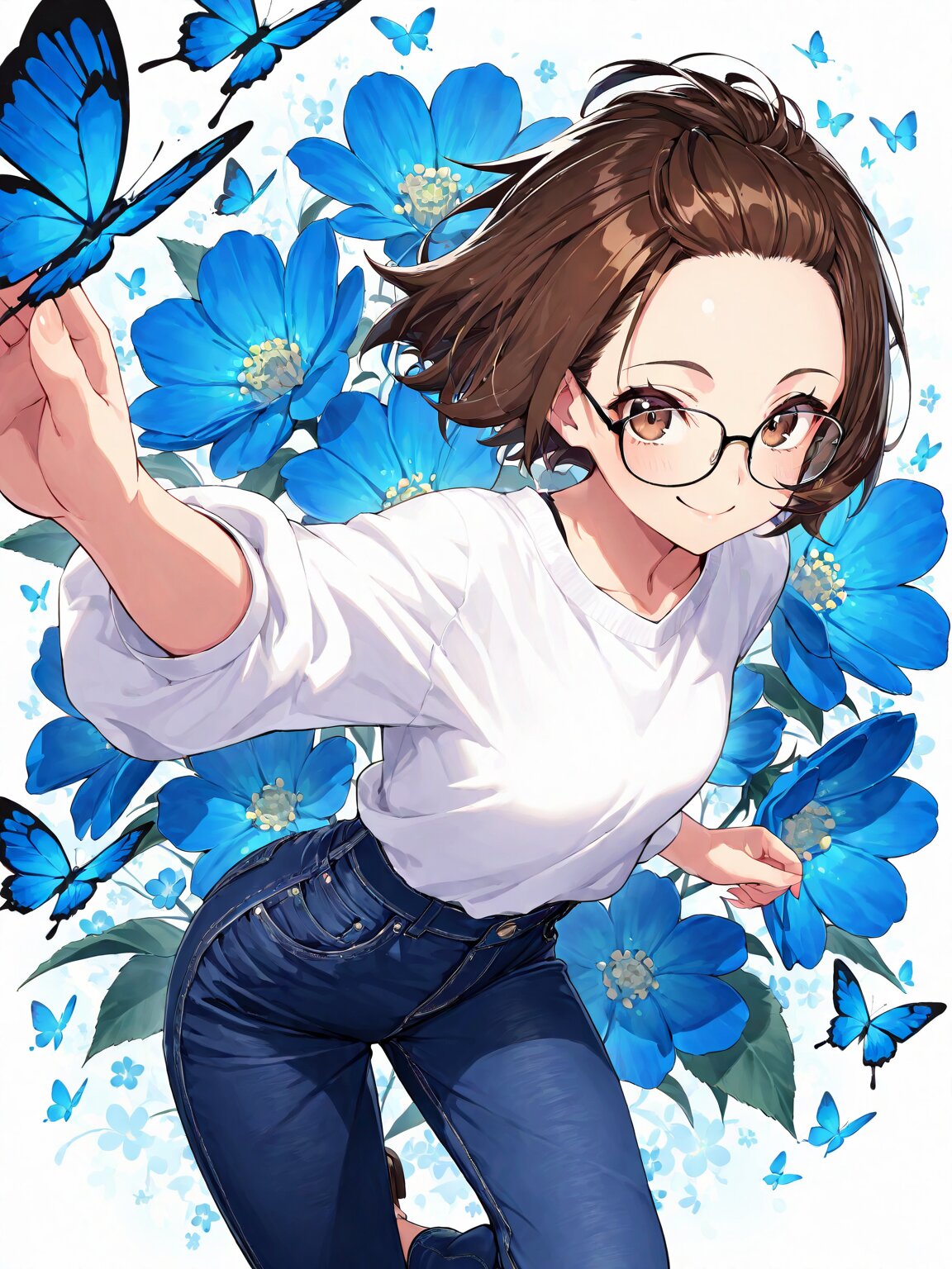 (sharp, 8k, Hires.fix, Ultra Super Fine detailed beautiful illustration), 8k resolution, masterpiece, beautiful highlight, expression eyes, beautiful eyes, solo, forehead, glasses, brown hair, brown eyes, short hair, casual fashion, blue denim pants, dynamic angle, dynamic pose, smile, many blue butterfly, beautiful blue flowers background