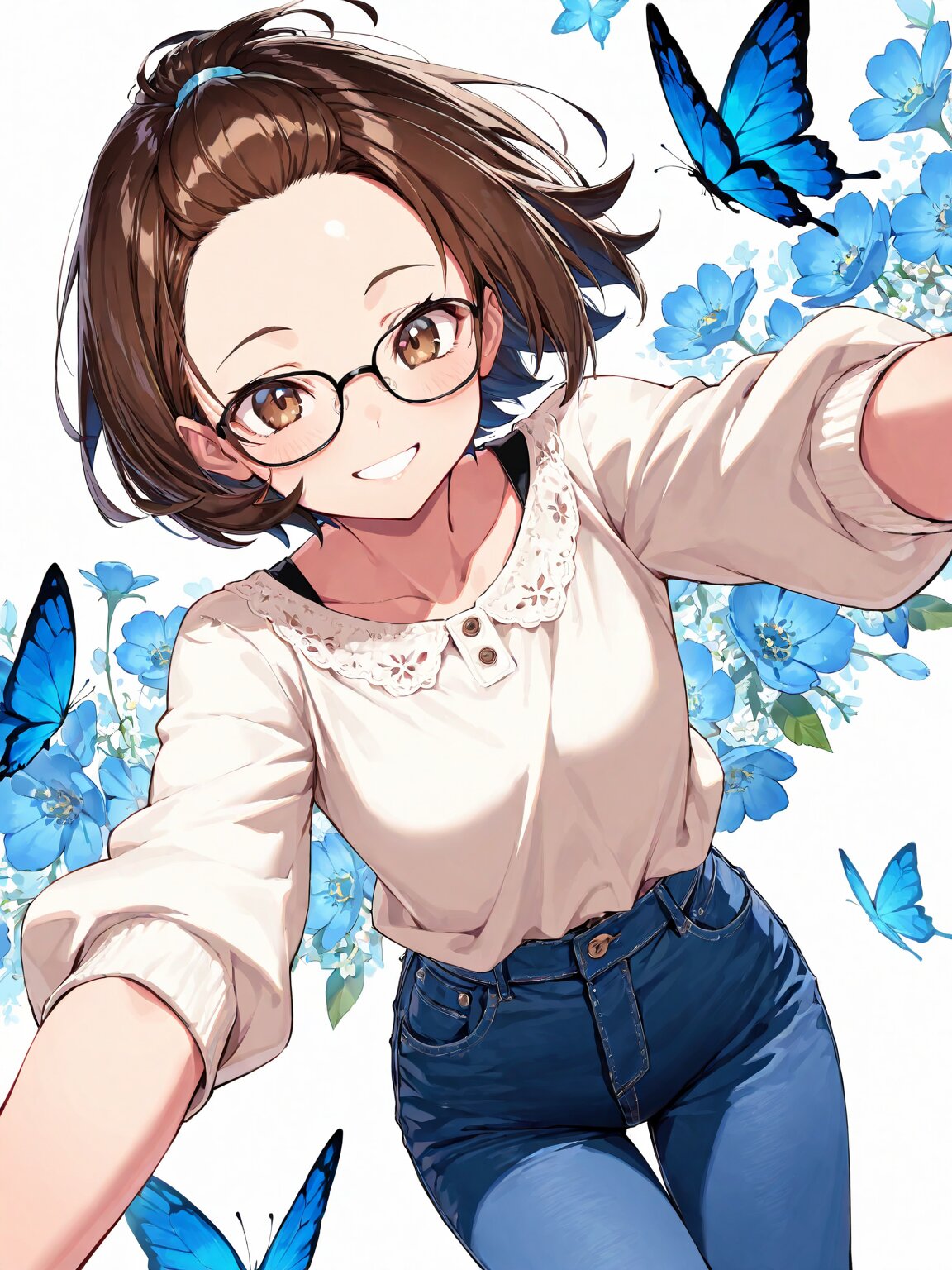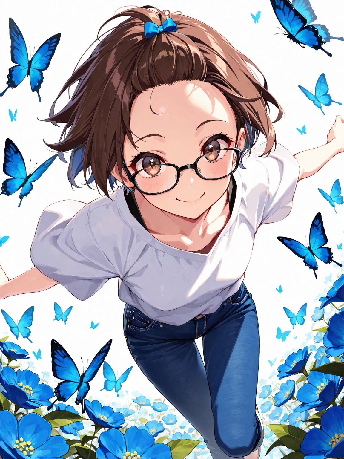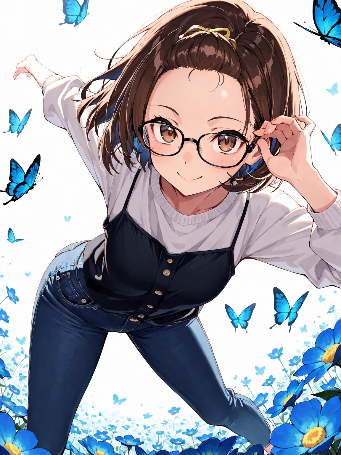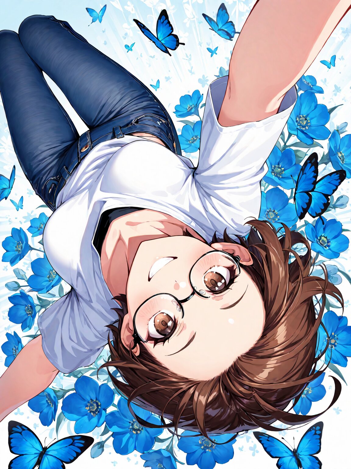 (sharp, 8k, Hires.fix, Ultra Super Fine detailed beautiful illustration), 8k resolution, masterpiece, beautiful highlight, expression eyes, beautiful eyes, solo, forehead, glasses, brown hair, brown eyes, short hair, casual fashion, blue denim pants, dynamic angle, dynamic pose, smile, many blue butterfly, beautiful blue flowers background