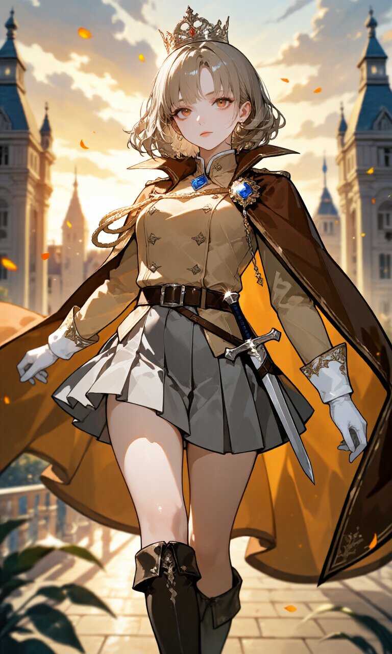 A stunningly detailed 1girl stands confidently in a dreamy London sunset, gazing directly at the viewer with piercing upturned hazel eyes. Her ash-blonde short wavy hair frames a delicate face with flawless, hyper-detailed skin. She wears a (baige Prince costume:1.5) with long sleeves, layered under a (brown luxurious Cape:1.3) that billows dramatically. The outfit includes a (gray luxurious mini skirt:1.3) and (baige luxurious boots:1.3), complete with (White gloves:1.2). A gleaming (dagger on waist:1.3) and ornate (crown:1.3) accentuate her royal aesthetic. The romantic academia atmosphere glows with golden hour light filtering through hazy clouds, casting soft shadows across the palace courtyard. Every thread of fabric, strand of hair, and glint of metal is rendered in insanely detailed 16k quality, creating a masterpiece of visual storytelling. The full-figured yet elegant posture radiates charm, blending fairytale whimsy with regal sophistication.