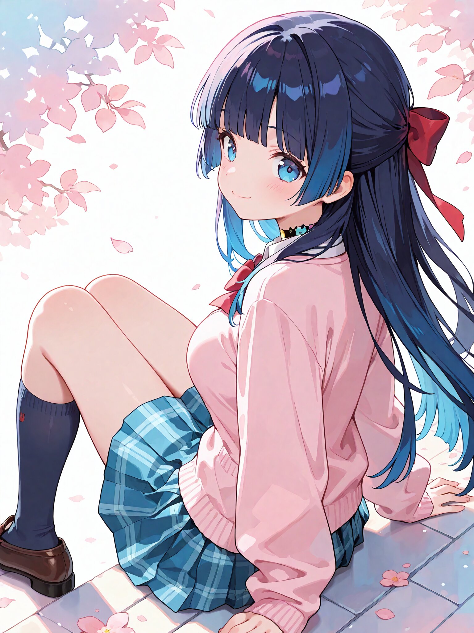 masterpiece,best quality,amazing quality,absurdres,very aesthetic,newest,(pastel colors:1.4),bright color,watercolor:1,1girl,large breasts,dark blue hair,long hair, (hime cut:1.1),blunt bangs,tareme:1.5,blue eyes, half updo,hair ribbon, BREAK wear a pastel pink cardigan over a white collared-shirt, pastel pinl cardigan, long sleeves, (button-up), (white collared-shirt:0.8), (big red ribbon bow on neck), vivid blue plaid pleated skirt, (navy knee socks), brown loafers, BREAK dynamic pose,smile, sitting, back view,side view,From above,from below,front view , BREAK watercolor background