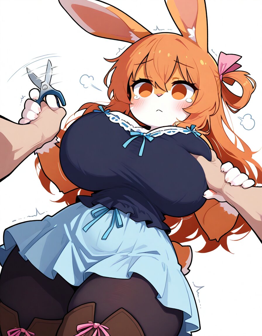 solo, short female, oppai loli, rabbit girl, furry female, huge breasts, slim, narrow waist, thick thighs, orange fur, fluffy body fur, stand fur, orange rabbit ears, rabbit nose, orange rabbit tail, orange hair, long hair, hair rings, pink ribbons, hair between eyes, orange eyes, round eyes, no pupils, tears, scared, layering, black camisole, blue ribbon-trimmed camisole, light-blue skirt, wide A-lines, black pantyhose, black pantyhose under clothes, brown thigh boots, pantyhose under thigh boots, expressionless, unemotional, puff of air, clipping her nails, nail clippers, pov grabbing her wrist, deep skin, skindentation, motion blur, motion lines, motion trail, afterimage, smear frame, trembling, looking ahead, from front, three quarter view, foreshortening, perspective, saturated, smooth, dramatic angle, white floor, white background, simple background, low contrast:1.2, softy, 2D, stylized, kawaii, cute, anime coloring, furry, two tone fur, furry body, perfect body, detailed face, high quality, cute clothes, animal tail, animal ears, solo, masterpiece, seductive mischievous expression, seductive demeanor, correct_anatomy, black pantyhose, masterpiece