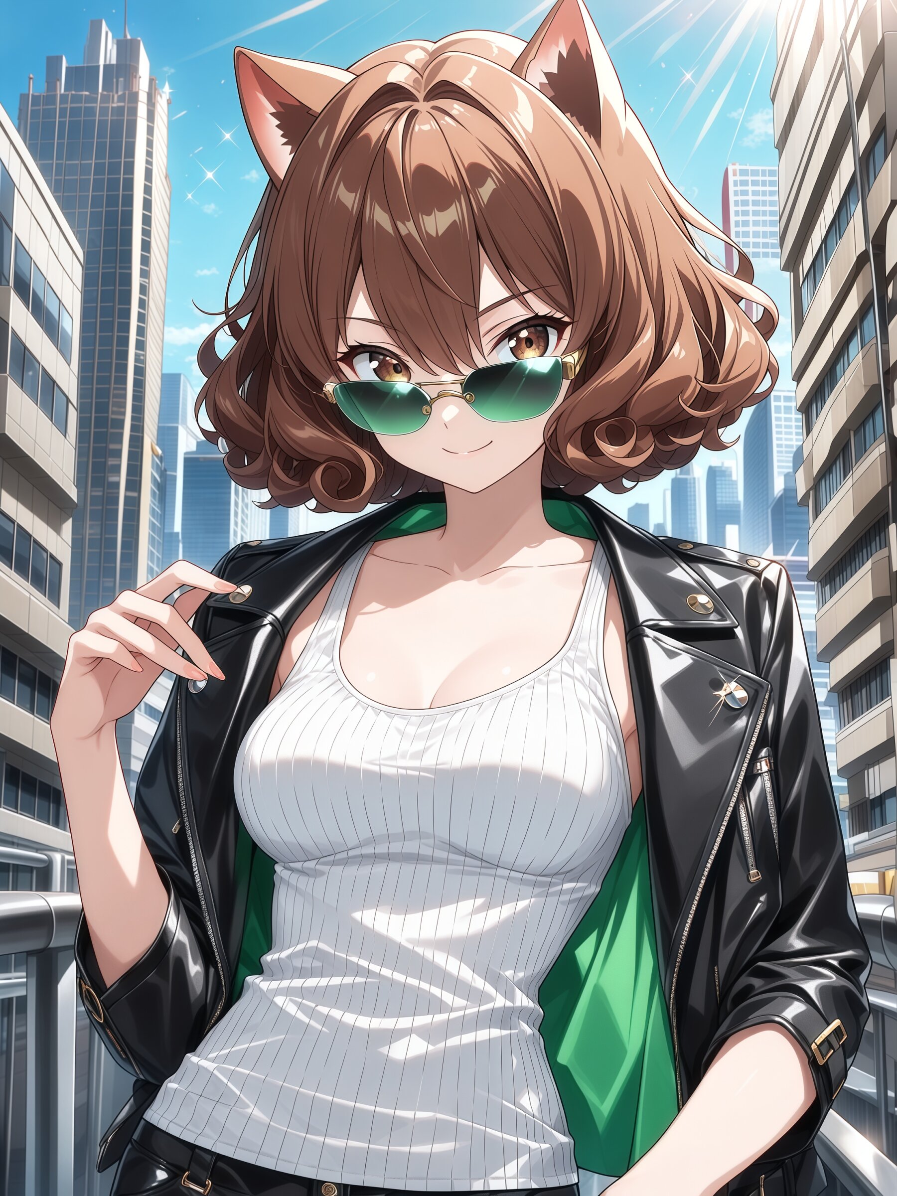 (masterpiece, best quality, ultra-detailed, intricate details, anime style, 8k illustration, shine colorful, vibrant colors), 1girl, brown cat ears, brown eyes, chestnut brown hair, wavy bob hair, hair between eyes, loose inward curls, tousled layers, (large breasts:0.8), (((pointed sharp sunglasses, narrow design, angled edges lenses:1.4), rimless, dark green lenses, metallic shine, green lens reflecting sunlight sparkles)), black leather jacket, white ribbed tank top, casual fit, confident smile, straight brow, cool confident pose, city background, sun light, blue sky,
