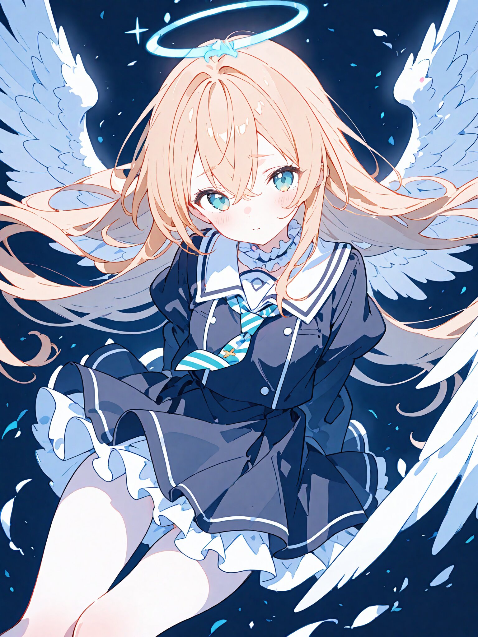 NSFW,anime,score_9, score_8_up, score_7_up, score_6_up, 1girl,newest,light brown,Abstraction,bright color, BREAK long hair flowing in the wind, big downturned teal eyes, soft eyebrows, pale skin, slim and ethereal body,crossed bangs,layered hair,angle wings, spread wings, BREAK torogao,dynamic pose, gothic school uniform,Frill collar,long tie, stripe tie , (mini skirt,Layered Skirt,Frill Skirt )