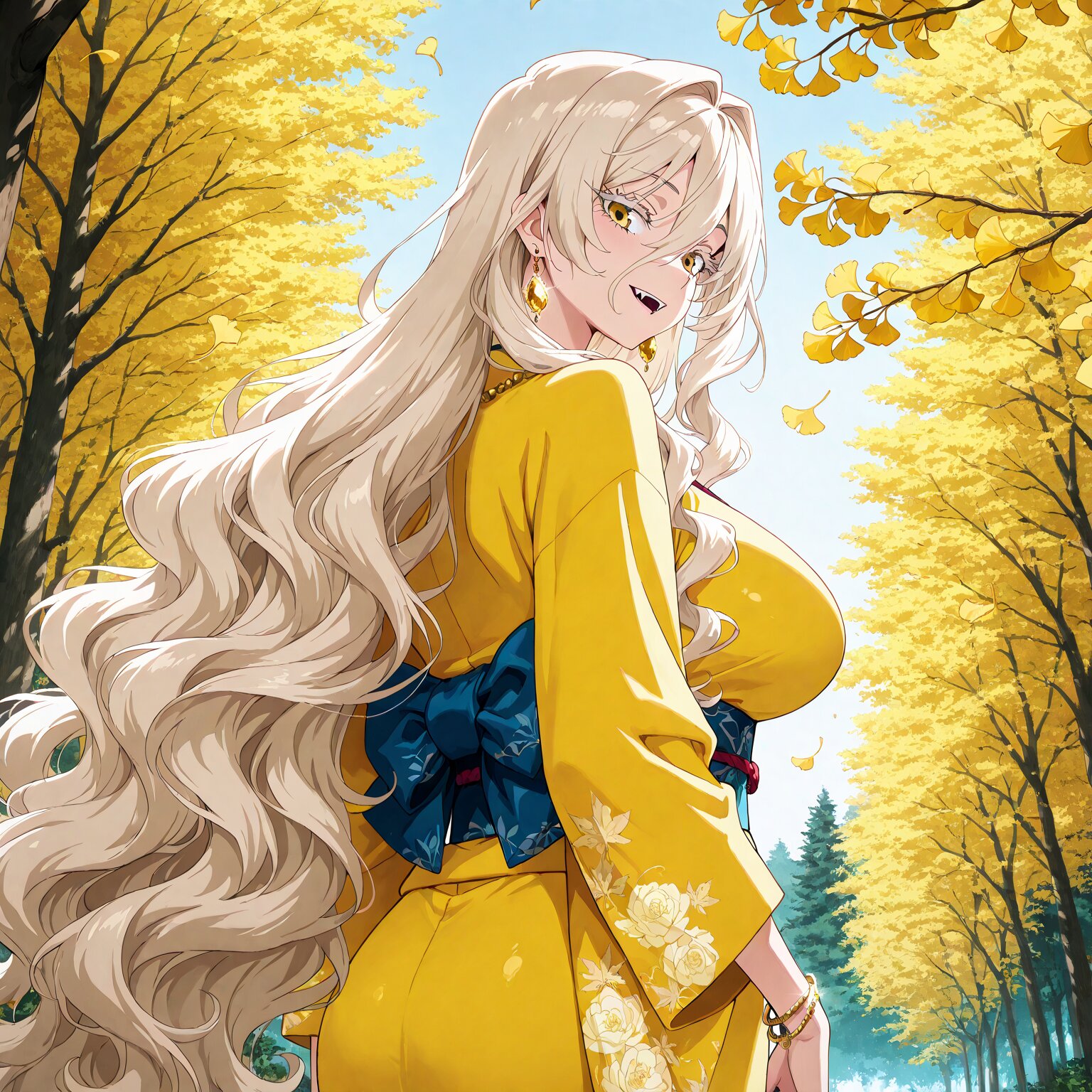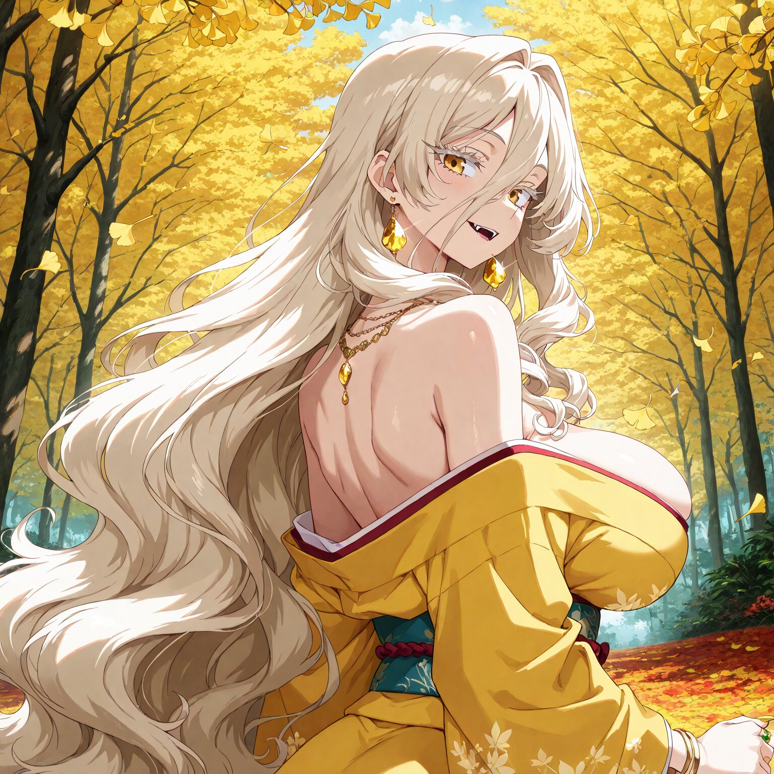 1Woman, mother beautiful, platinum blonde hair, beautiful hair, ((bangs, long bangs)), beautiful eyes, golden eyes, ((very long hair, curly hair, wavy hair:1.2)), Voluminous hair (Sharp eyes), (long eyelashes), golden nails, very long nails, long fangs (Adult, voluptuous figure, very large breasts, heavy breasts, long breasts, round breasts: 1.3), (tall), toned body, ((lustrous body, gloss)) Earrings, golden jewels, golden jewel earrings, jewel ring, golden jewel necklace, Bracelets, anklets Kimono, yellow kimono, fur, back view, looking back, autumn leaves, yellow leaves, ginkgo, Outdoors, forest, falling leaves upper body BREAK, ((newest, anime, animation, anime screen capture, anime style:1.3)) BREAK, ((masterpiece, , vibrant, very aesthetic, highly detailed, best quality, 16k:1.3)) ultra HD,8k,24k,professional composition, amazing quality, best quality, ultra-detailed, very aesthetic, aesthetic, highres, absurdres, HDR, high resolution,great score, masterwork, intricate details