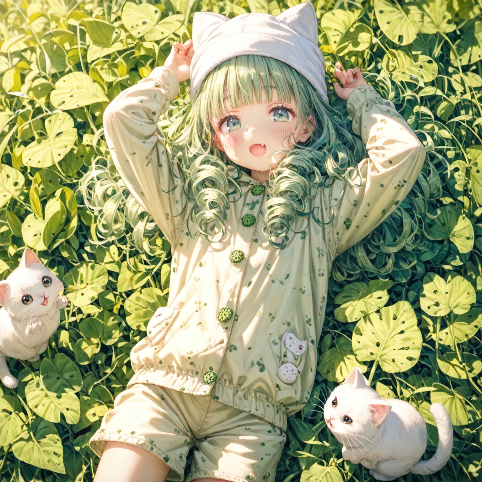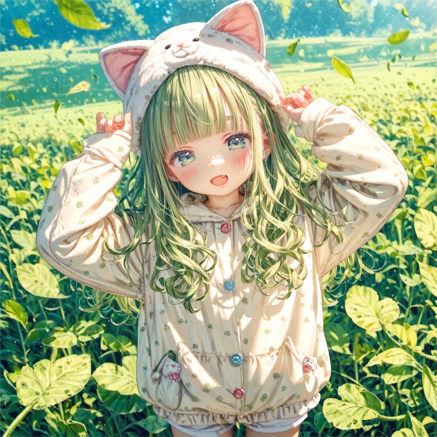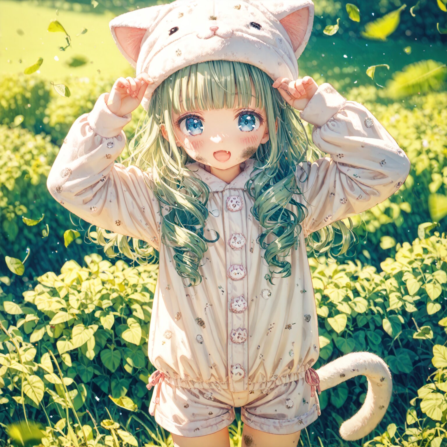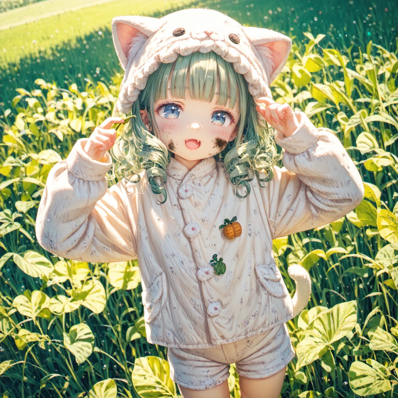 score_9, score_8_up, score_7_up, score_6_up, score_5_up, score_4_up, rating_safe, best quality, ultra hi res, detailed drawings, exquisite depictions, (abstract surrealism:1.3), cowboy shot, dynamic angle, a cute loli girl, detailed face, shinny hair, cute girly hairstyle, blue eyes, Glossy pink Lips, 1 girl, (white cat ears:1), (white cat tail:1), detailed face, (half-open eyes:1), light green eyes, (light green hair), (curly hair:1.2), Blunt bangs, slender body, (long sleeve fleece pajamas), (short pants), fleece cat slippers, white nightcap, dirty with soil, cute smile, open mouth showing fang, blush, arms up, (holding green leaves:1.3), BREAK (a brown teddy bear:1), (Vegetable harvest theme:1.2), The fields are covered with green leaves. blue sky, sun lighting, beautiful lighting, perfect lighting, <lora:flat_sdxl:-2>