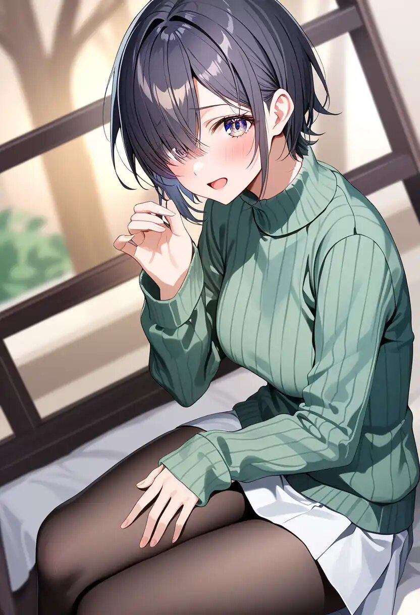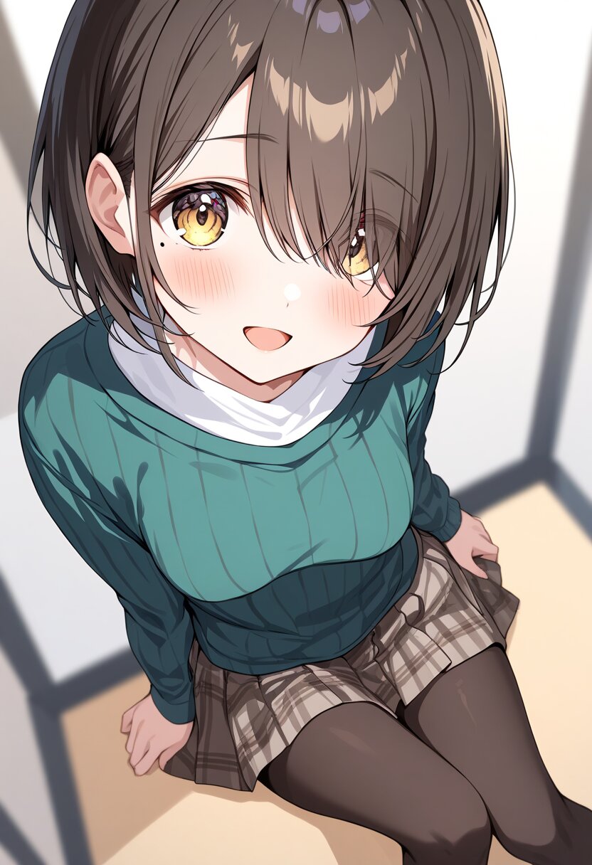 green_ribbed_sweater,skirt,miniskirt,black_pantyhose,:d,looking_at_viewer,depth of field,from_above,hair over one eye、aroused、early teen、dark skin、solo、black hair、short hair、tareme、1girl、blurry background、