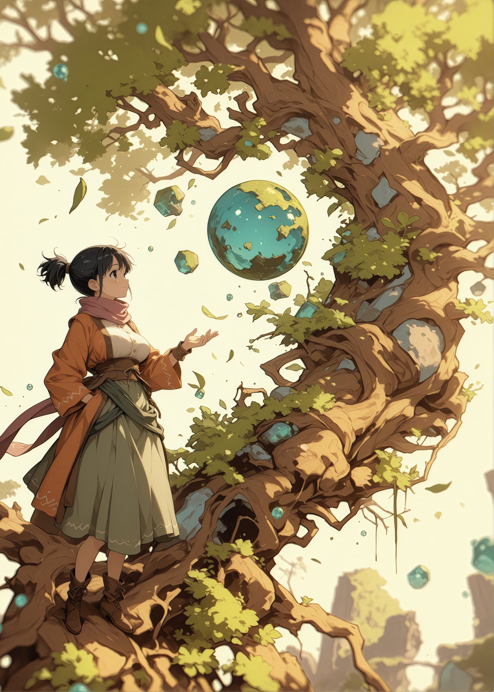 Best quality, Masterpieces, simple background, negative space, anime-style illustration, white background, fine detail, solo, 1girl, (young girl), cute face and eyes, black hair, clear black eyes, big breasts, single short ponytail hair, cute and lovely, Vigorous, lively, and spontaneous personality, Ancient mossy ruins in a giant tree forest, fairies dancing in emerald glow, mysterious and serene. , cinematic angle, cinemagraph style, official art, official wallpaper