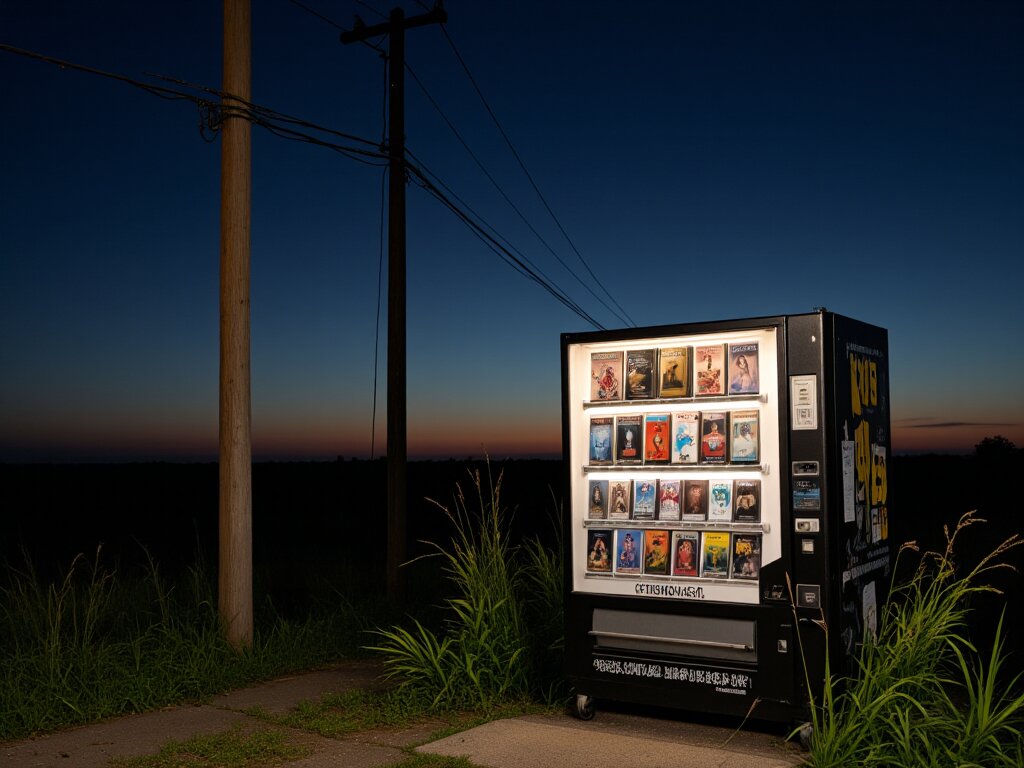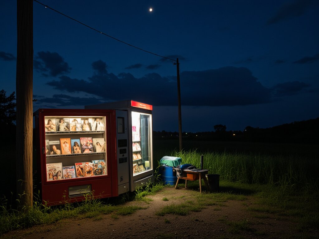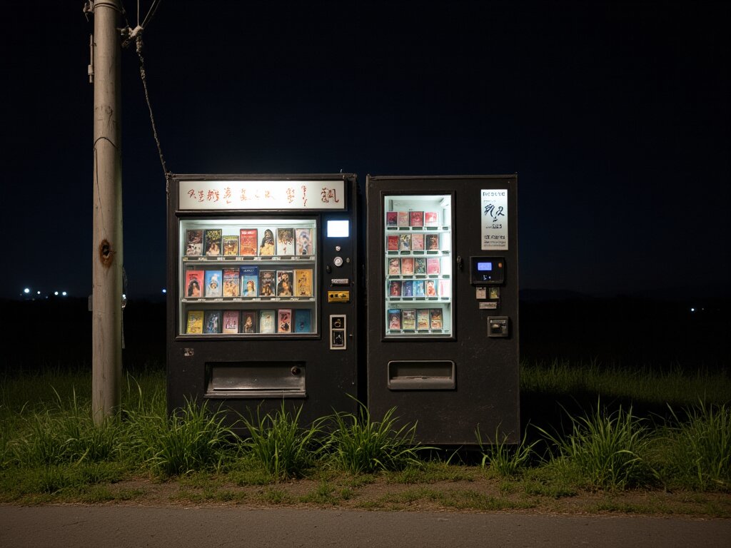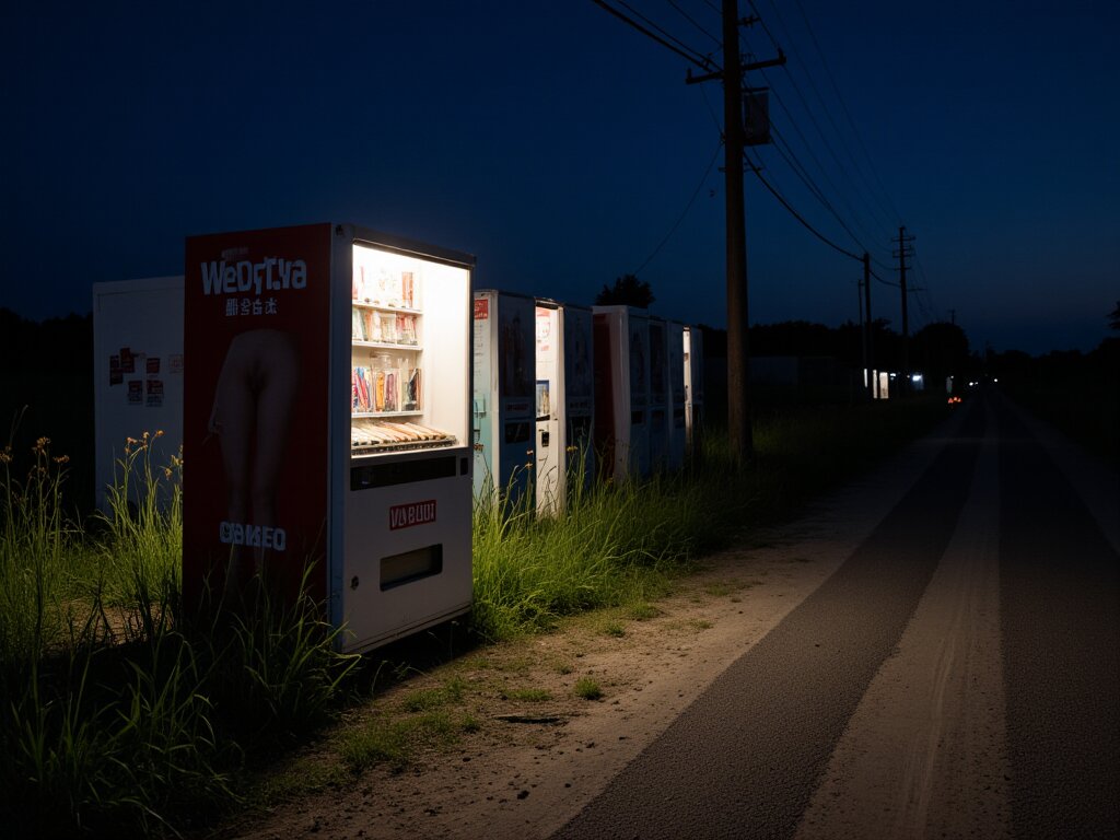 Please depict this in a realistic Photo Style. A vending machine selling Japanese adult books (for ages 18 and over) is installed. This vending machine sells books featuring erotic and sensual photographs of women. The vending machine is quietly installed on a rural field path in a provincial Japanese city. Multiple vending machines are set up. A utility pole stands nearby to provide power. Weeds grow around the area. It is already nighttime, with only the faint light leaking from the vending machine illuminating the surroundings. The machine has been installed for many years and is quite worn. It exudes an indescribable nostalgic atmosphere reminiscent of the Showa era, captivating the viewer's heart.