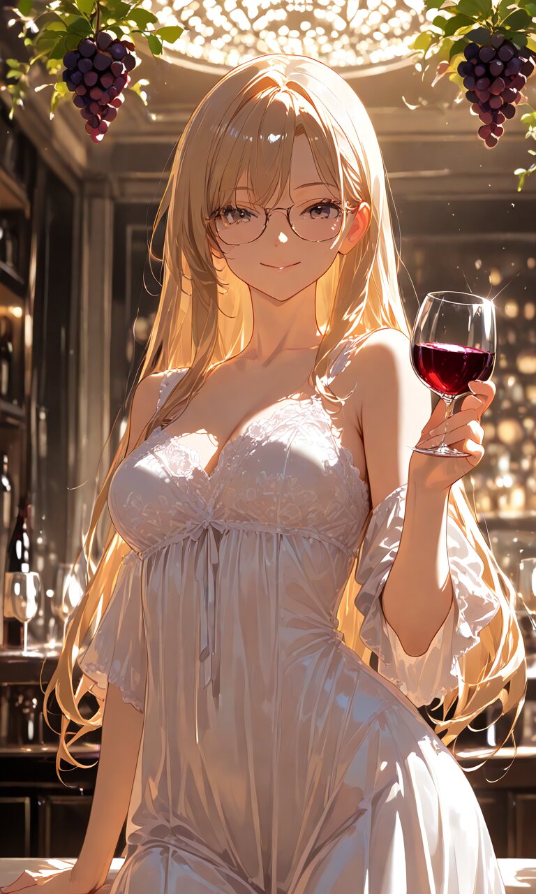 (best quality),(masterpiece),(ultra detailed),1 lady, long hair, blonde hair, glasses, smile, night gown, (holding wine glass, purple glass), (grapes on background)