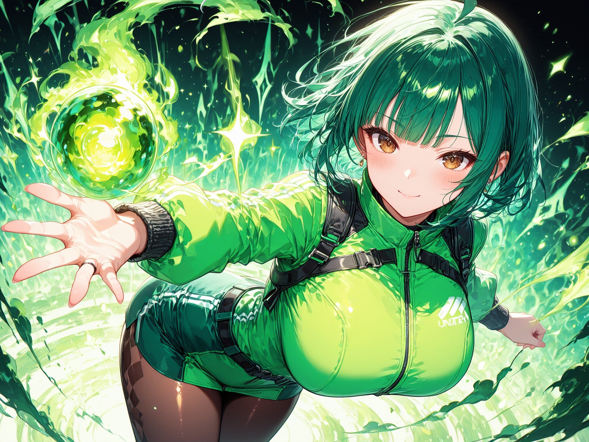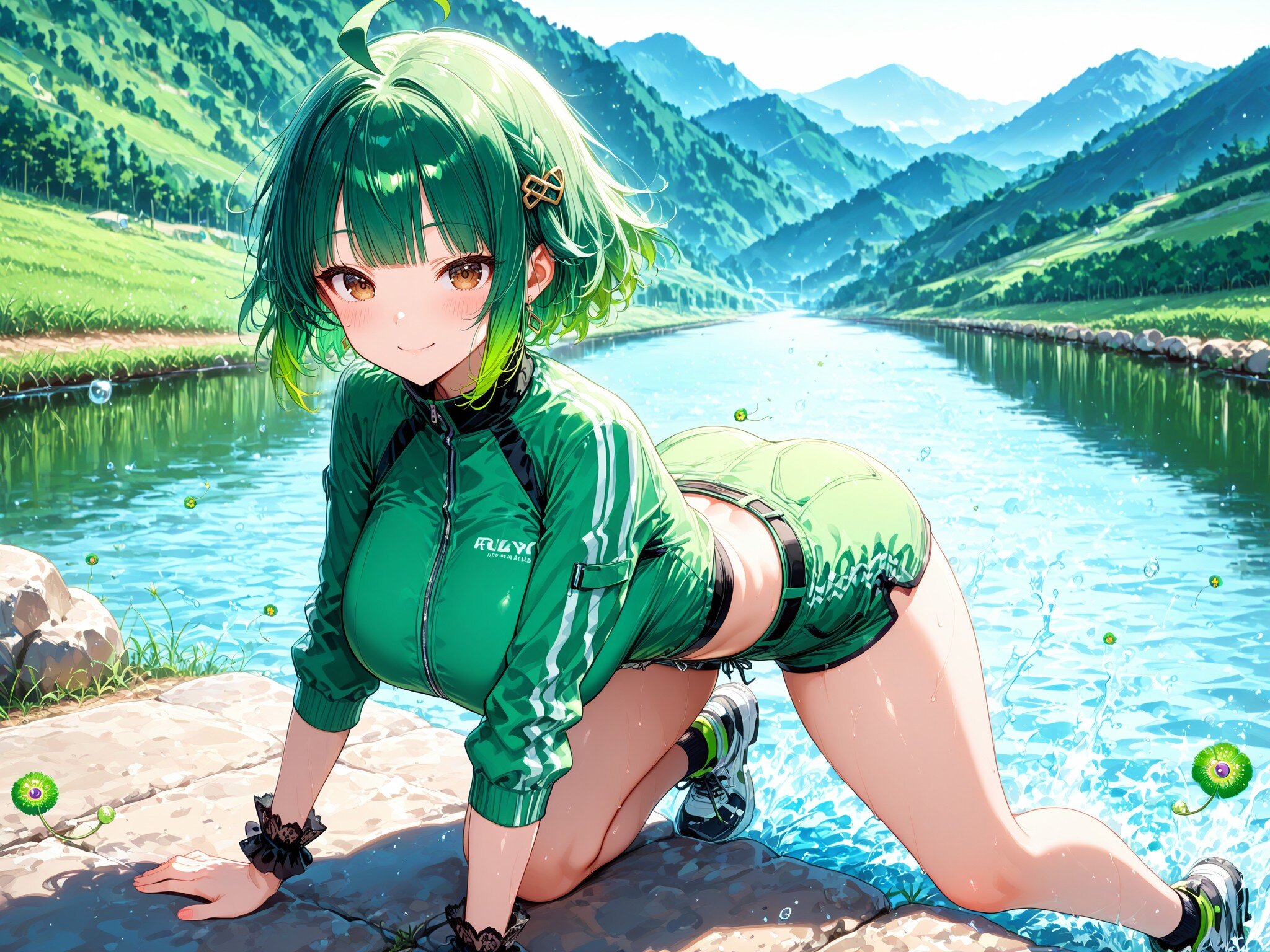 a blissful expression, ecstatic look, serene smile, (green outfit:2.0), (dark green hills green river, green cosmos:2.0),