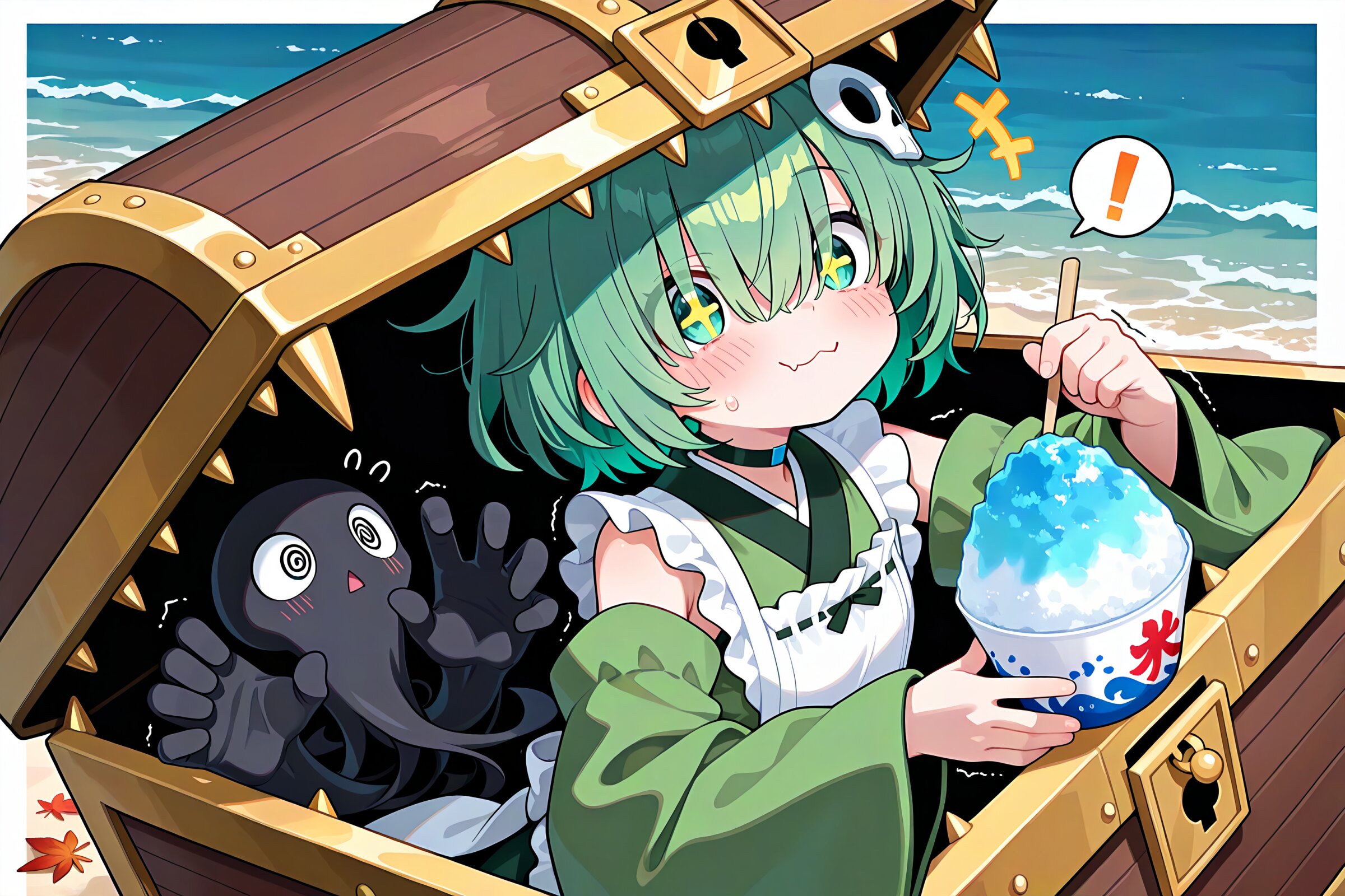 1 little girl, solo, diagonal angle, masterpiece, best quality, amazing quality, very aesthetic, cobalt green hair, short hair, messy hair, (hair over eyes:1.2), green eyes, demon fangs, +_+, closed mouth, smile, cheerful, +++, notice lines, @_@, chestnut mouth, confused, blush, tearful, spoken exclamation mark, trembling, sweat, choker, green wa maid outfit, (oversized sleeves:1.2), detached sleeves, (floating black ghosty hands:1.2), skull hair ornament, holding blue shaved ice, in mimic chest, kooribata, autumn, ocean, sand beach, maple leaf,