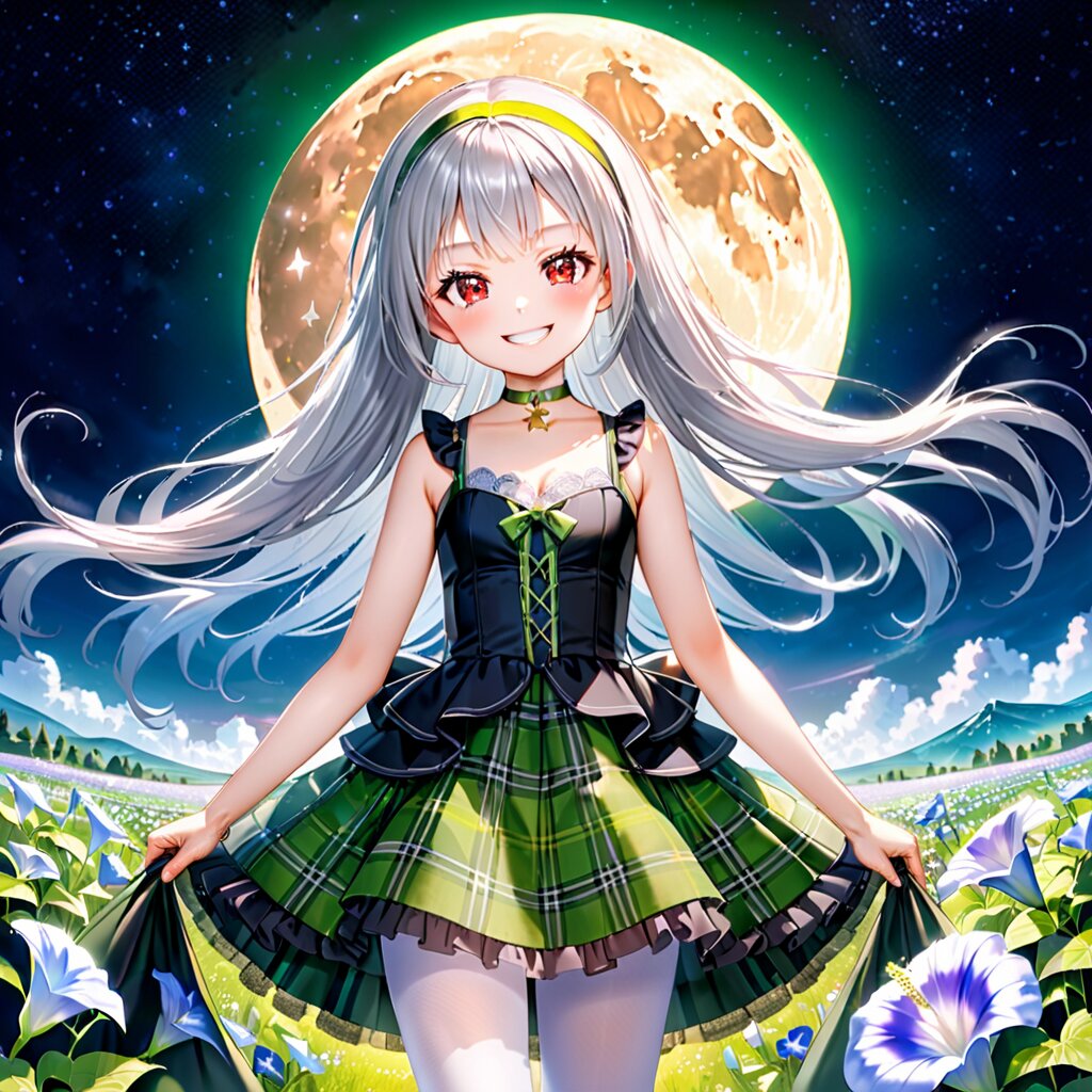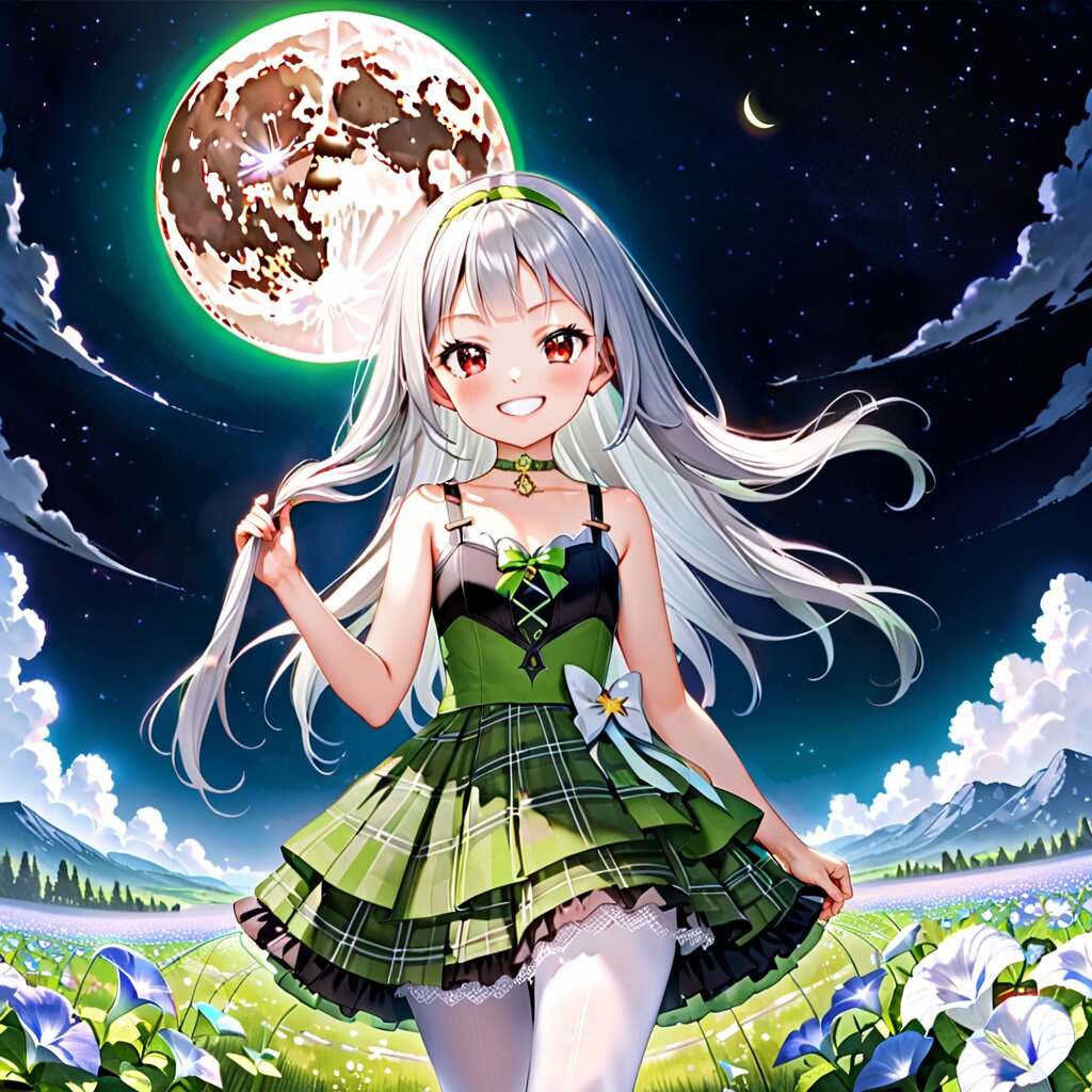 緑色AIカーニバル出品作品(夜の草原を歩く緑を纏う少女)【リメリア】