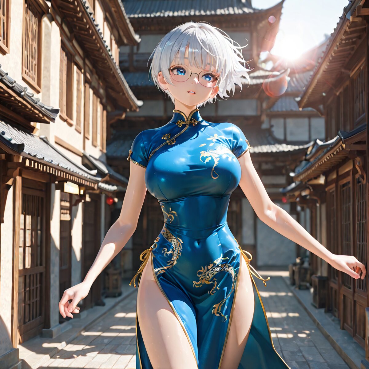 masterpiece, best quality, amazing quality, 4k, very aesthetic, high resolution, ultra-detailed, absurdres, newest, scenery, 3d, rendered, 1girl, solo, glasses, silver hair, very short hair, choppy bangs, parted lips, blue eyes, china dress, large breasts, dynamic, building, standing, soft lighting, floating hair, BREAK, hands, fingers, (dappled sunlight, lens flare:1.2), vignetting, dramatic shadow, cinematic lighting, rim light, detailed background, depth of field, vignetting, volumetric lighting
