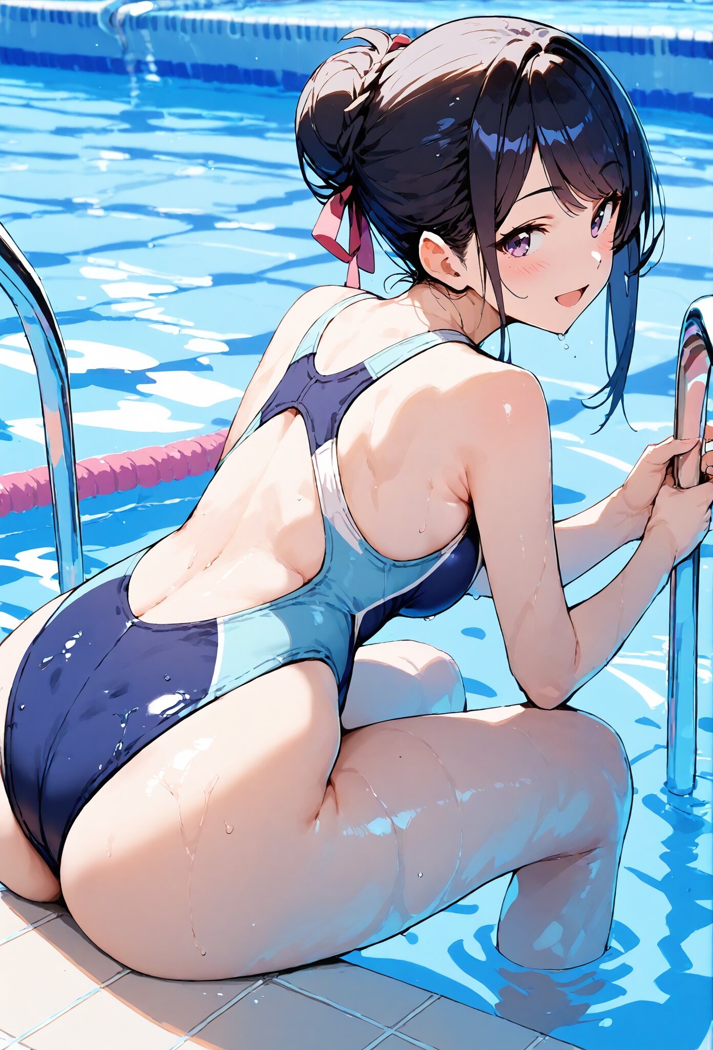 anime,score_9, score_8_up, score_7_up, score_6_up, 1girl , long hair, black hair, bangs, purple eyes, blush, collarbone,breasts, swept bangs, thighs,competition ,hair ribbon,Messy bun, open mouth,(flat color:0.5),smile, pool,from above