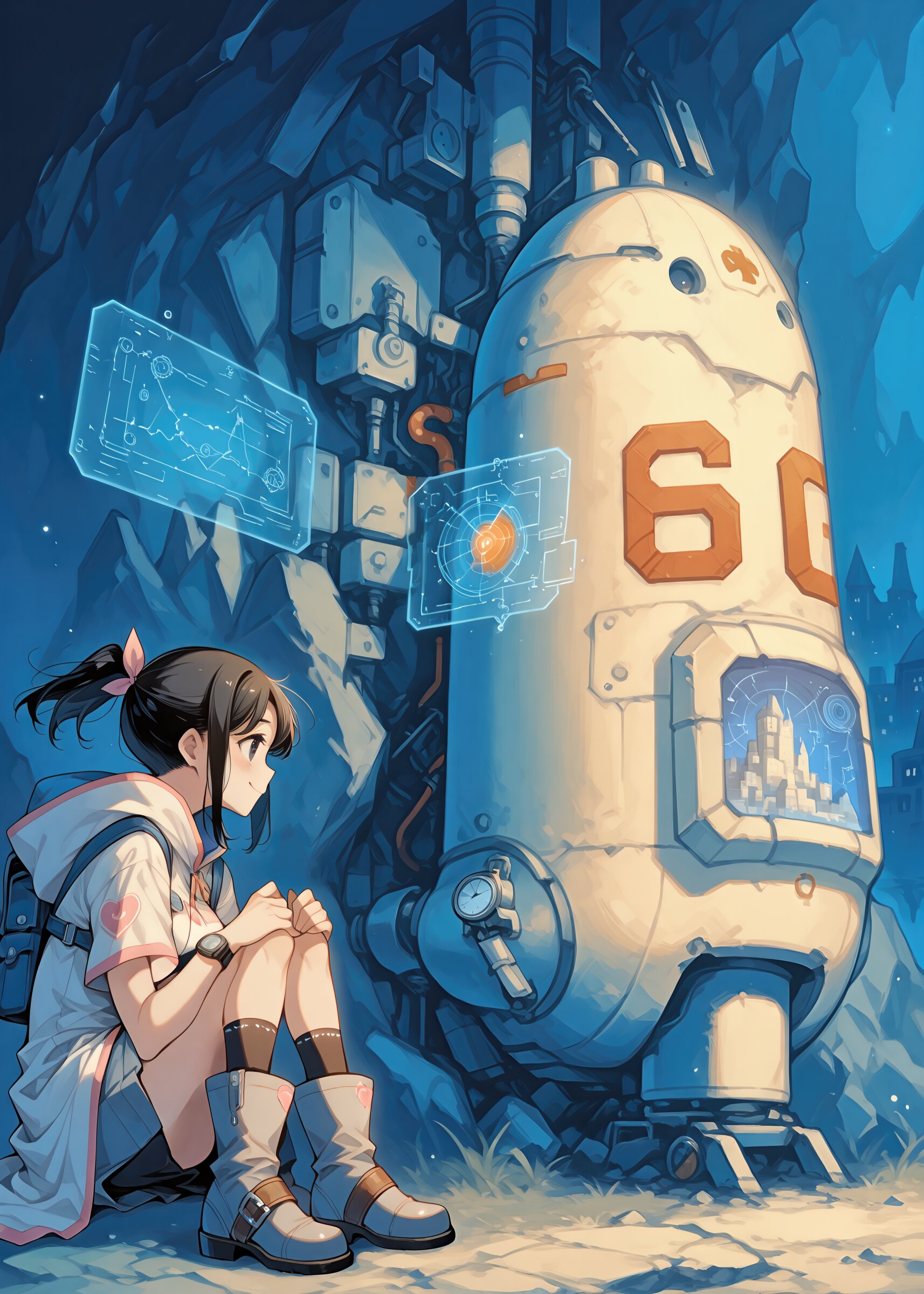 A girl watches as futuristic tools design a fortress city. Within the cave, the city's blueprint appears as a hologram. 1girl, (young girl), cute face and eyes, black hair, clear black eyes, big breasts, single short ponytail hair, cute and lovely, Vigorous, lively, and spontaneous personality, smile,