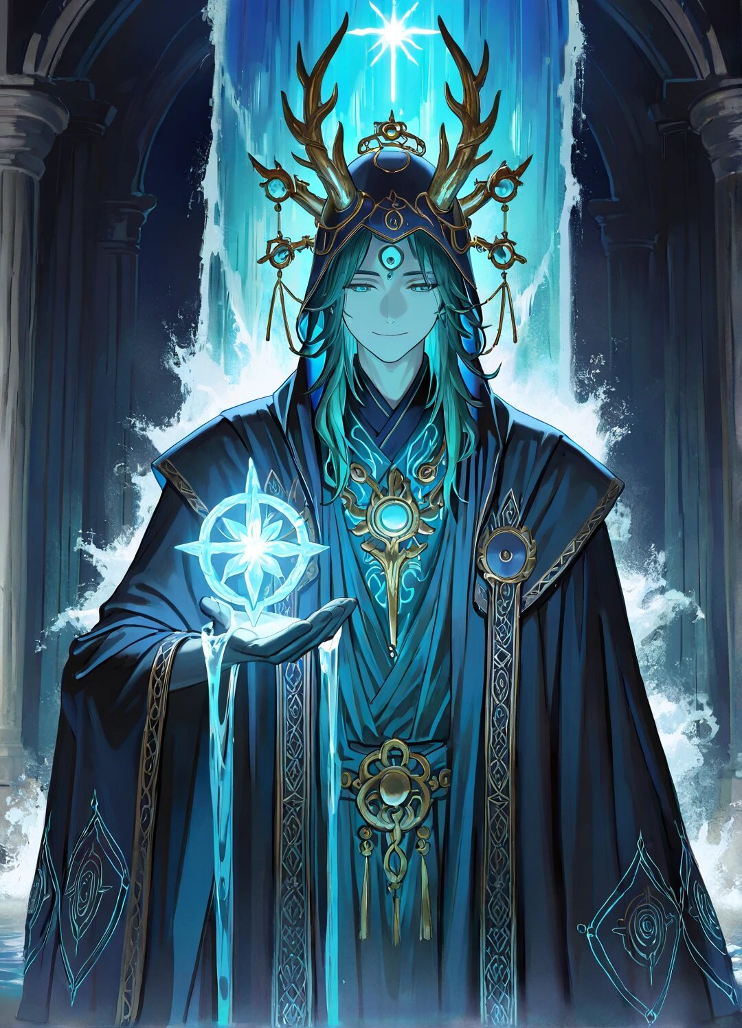 Full-body cinematic portrait of Watatsumi, the Japanese sea god, clad in deep blue ancient court robes embroidered with waves and dragons. He stands beside a glowing waterfall under moonlight, his figure illuminated by silver-blue reflections. His tranquil smile embodies purification and truth. Hyper-realistic, ultra-detailed, 8K resolution, professional photography style.