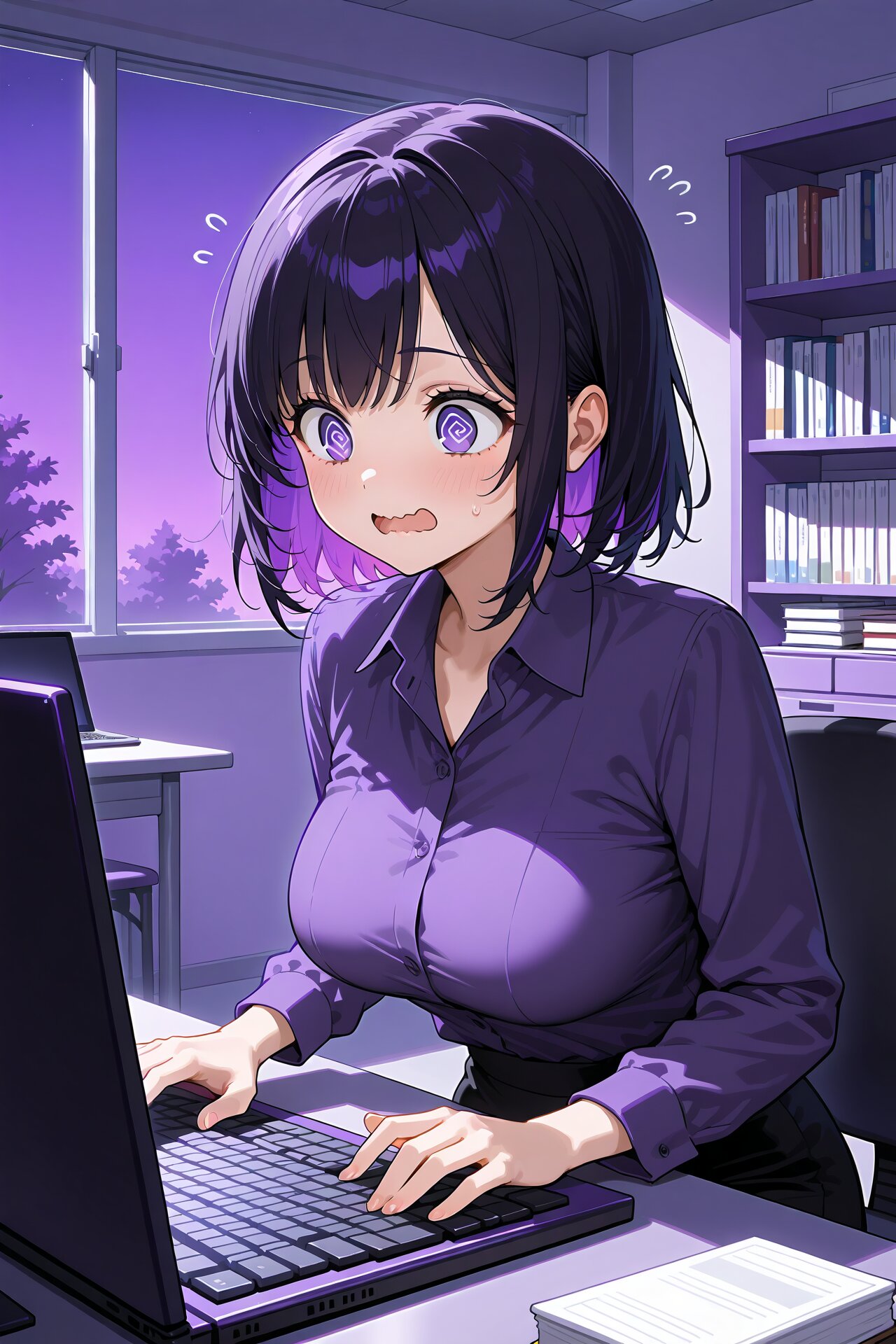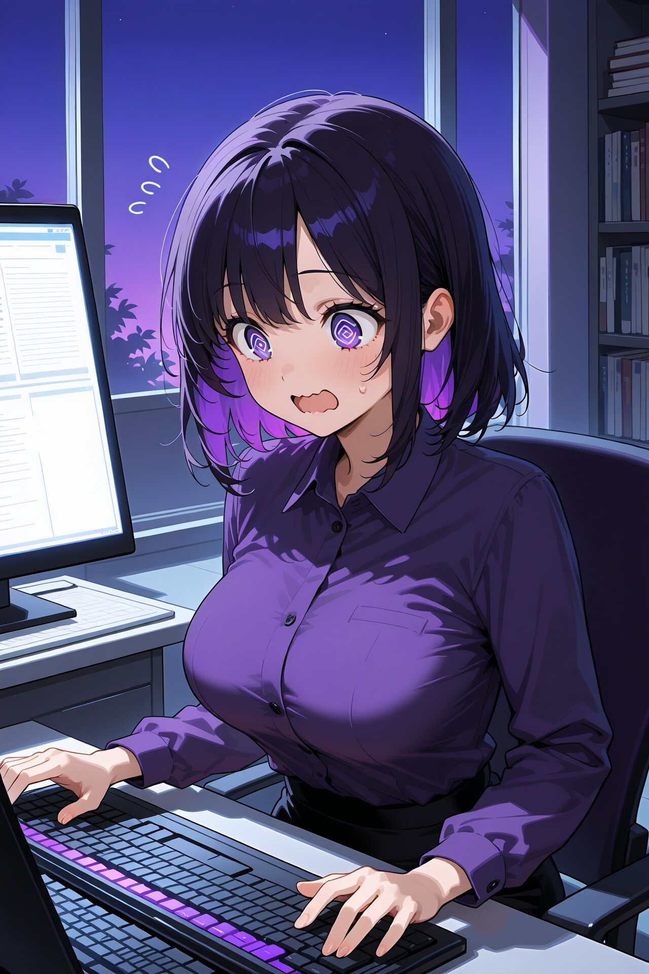 two-colored hair in red and black, big breasts, black hair, purple hair, Medium breasts, happy, purple background, purple theme, purple sky, purple autumn, purple clothes, detailed costume, autumn clothes, Office lady costume, wide open mouth, wavy mouth, flying sweatdrops, surprise, closed mouth, book, bookshelf, chair, computer, desk, indoors, keyboard \(computer\), laptop, looking at monitor, purple monitor, mouse \(computer\), office, desk, purple shirt, sitting, solo, window, Touching keyboard, @ @, night,