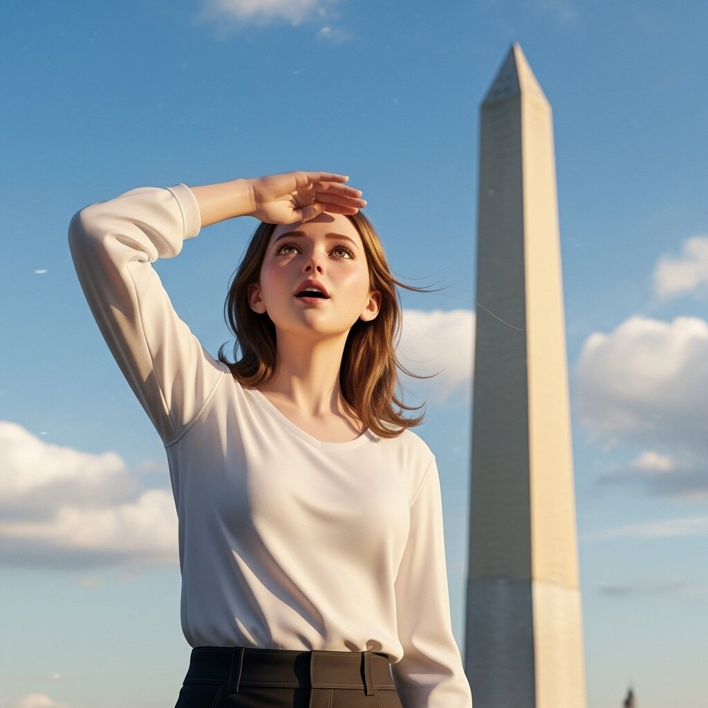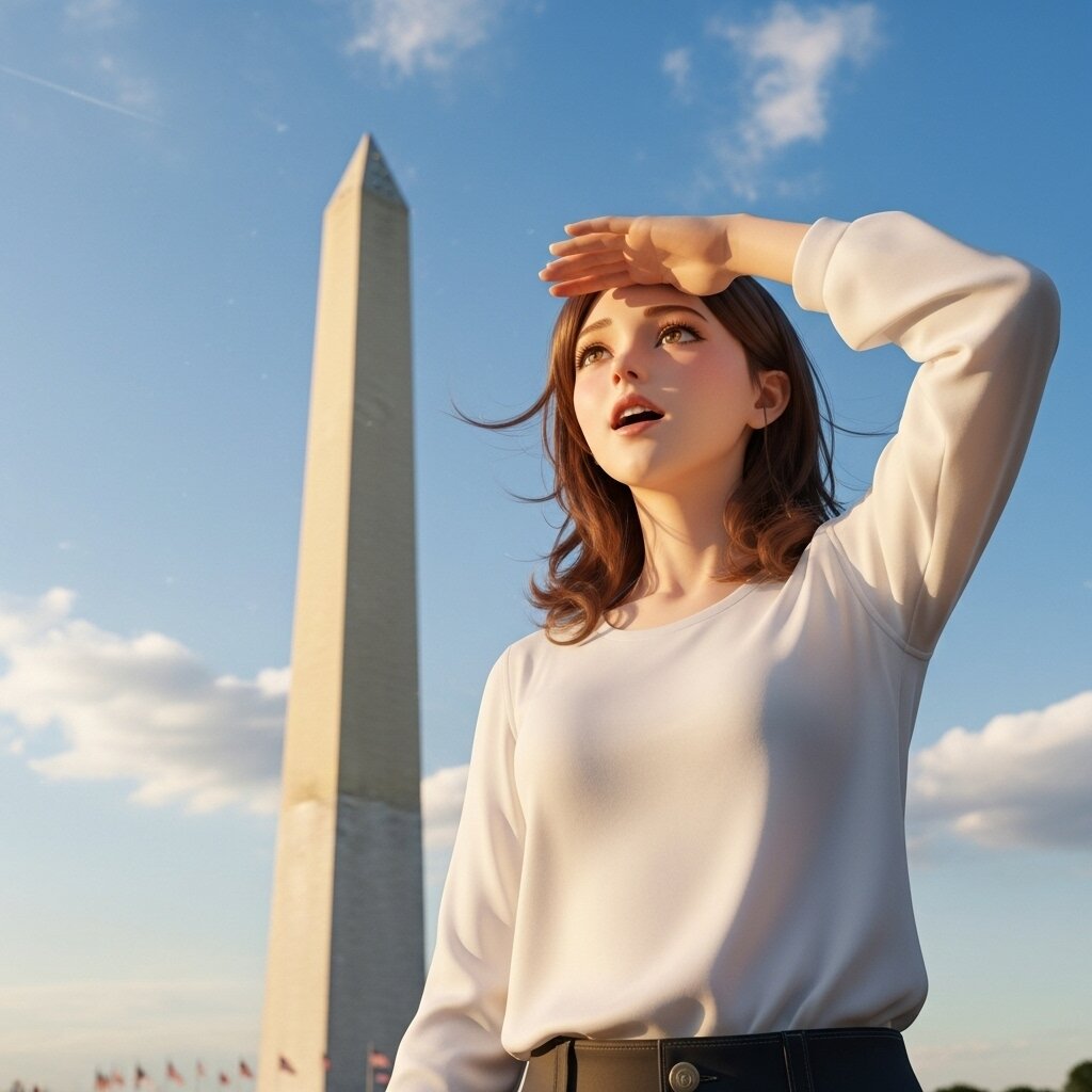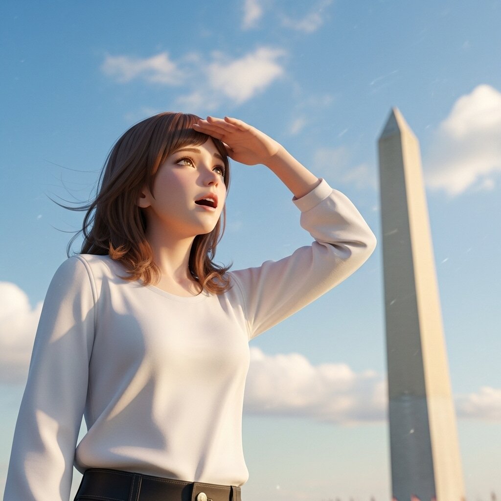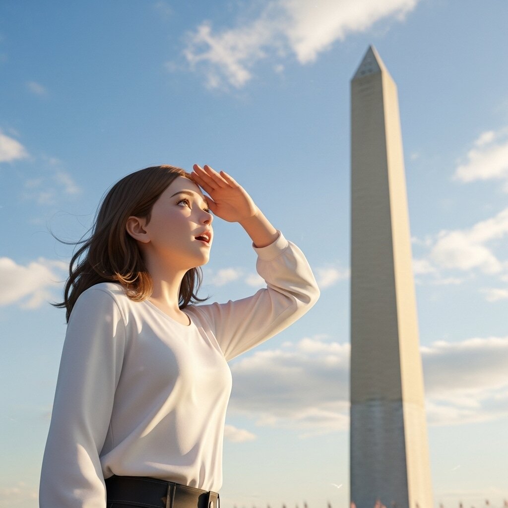 Please draw in a semi-realistic style. She looks up at the Washington Monument, which she is seeing for the first time, and is stunned by its size and beauty. The sky is beautifully clear, and the clouds reflect the sun's light. A gentle breeze blows, as if welcoming her visit.