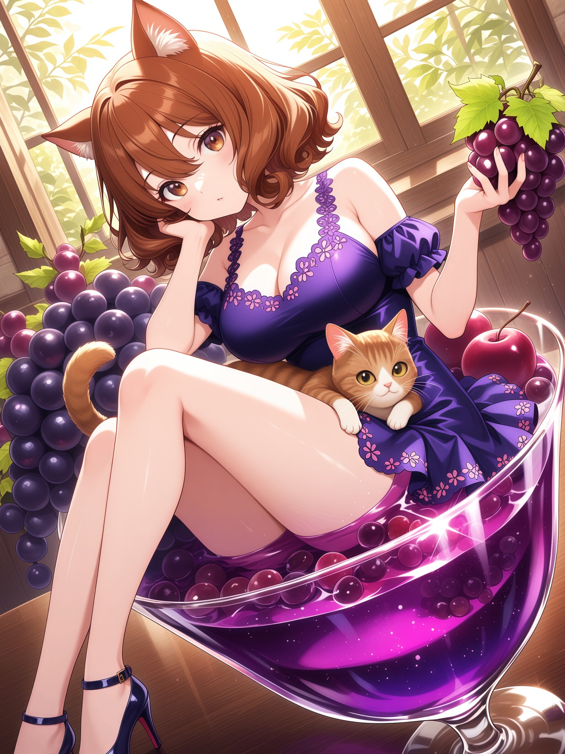 (masterpiece, best quality, ultra-detailed, intricate details, anime style, 8k illustration, shine colorful, vibrant colors), 1girl, brown cat ears, brown eyes, chestnut brown hair, wavy bob hair, hair between eyes, loose inward curls, large breasts, in container, violet mini dress, high heels, sitting, wineglass, in wineglass, looking at viewer, holding grapes, grape juice,