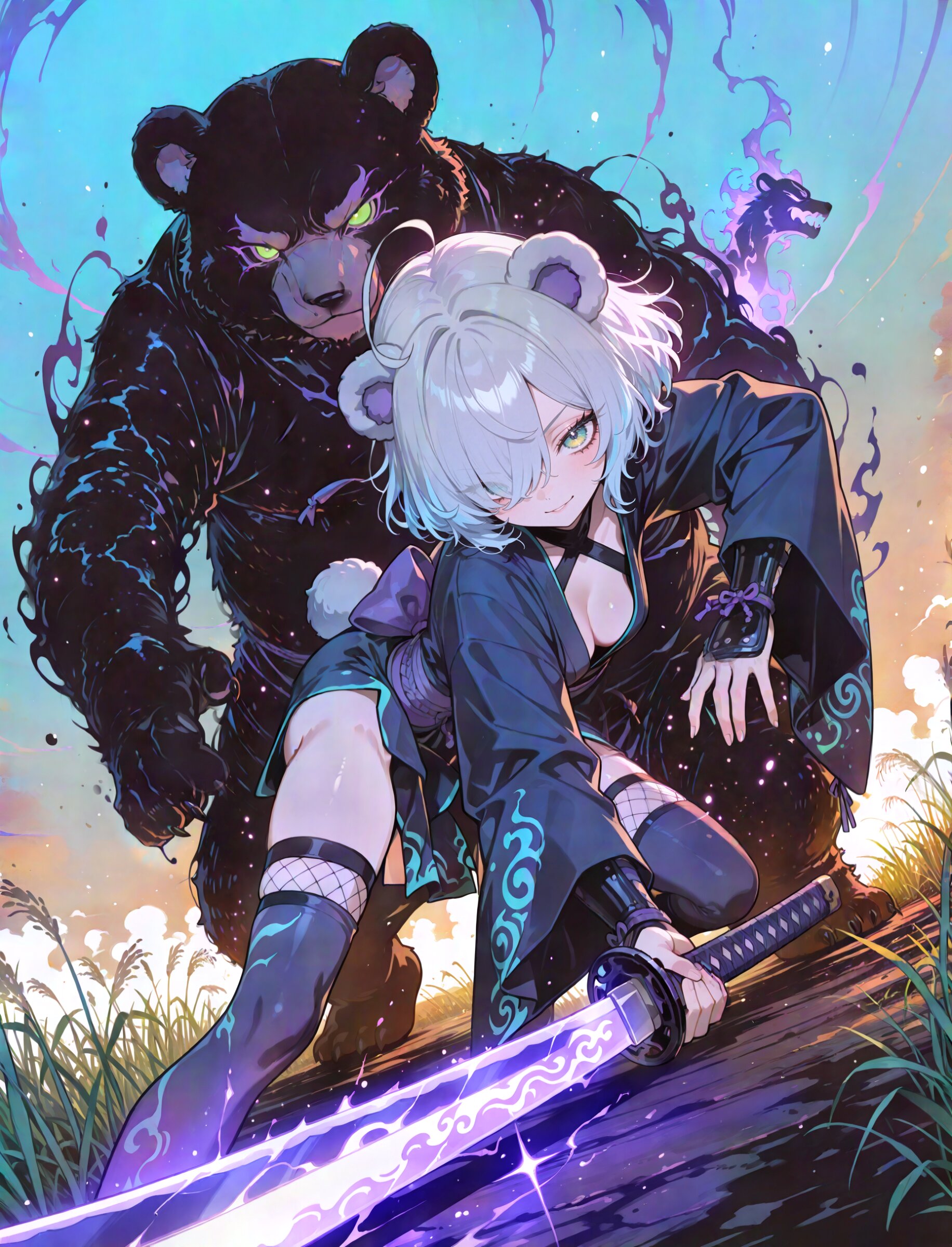 foreshortening, (close up:1.0) , (dutch angle:1.2), autumn atmosphere, earthy color, glowing light purple bear energy, light purple silhouette of serious bear guardian, huge bear aura, 1girl, samurai, (muscular female:0.65), multicolored hair, grey hair, pale blue and bisque and white hair, short hair, wavy hair,hair over one eye ahoge skinny hair, ,, beautiful lime green eyes small breasts, ,, ninja cloth, short kimono, obijime, fishnet inner, fishnets, fishnet thighhighs, ninja pants,, kote, (ninjutsu:1.1), (holding ninja sword:1.1) , , cleavage, zouri, ninja pants, bear ears, bear tail, ,, japanese clothes, seductive smile, dynamic pose, kung fu attack, kung fu action, kuji-in, ninjutsu, floating weapon, tantou, henshin, transformation, smoke, monsterification (swirling ink effects:1.2) fleeing, beautiful metallic luster, sharp katana, ultra detailed katana, silver particles, light trail, The background is a solid, bright light purple, creating a striking contrast with the intricate, multi-colored design of the character, (dancing silhouette:0.0), pop color background, (high saturation:1.2), drop shadow, ink-drenched shadows, solid black shadow blocks, abstract ink swath background, heavy chiaroscuro, high-contrast inky shading, negative space, grunge texture, calligraphic strokes, susuki grass, super fine concept art, unreal engine, graceful eyes, masterpiece, best quality, amazing quality, very aesthetic, absurdres, newest, professional art lots of details, , overexposure, sumie effect style, 4ur4_illu,shiny, glowing, glowing particles, glowing light particles, light particles, light particles, <lora:noline (1):-0.5> <lora:sdxl2-flat2-512b:0.2> <lora:facelightup_xl_v10:0.5> <lora:V2_yakumo_alchemy:0.5> <lora:Aura_illu:0.1>