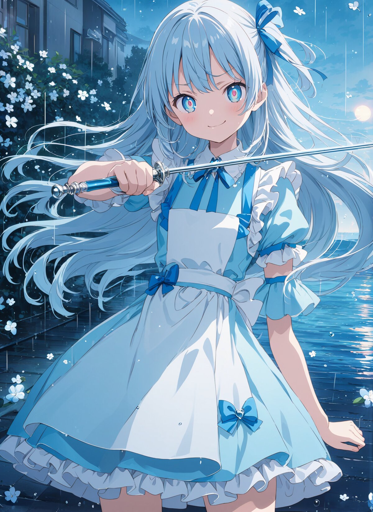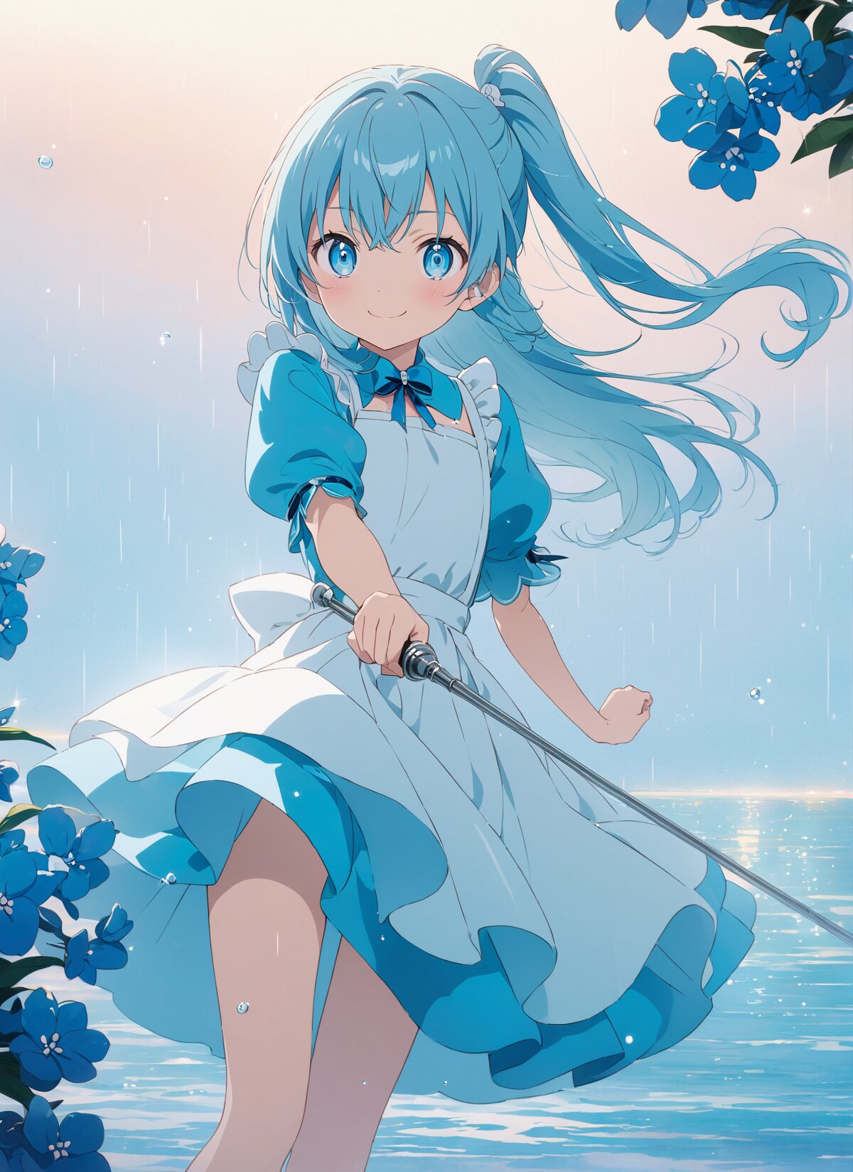 cowboy shot,kawaii,loli,petite,flat chest, (masterpiece, best quality, anime illustration),cool and intelligent teenage girl representing water,magical girl outfit inspired by Alice in Wonderland,blue dress with white apron,frills and ribbon accents,half-up flowing hair,mocking smile with sharp eyes,holding a slender polished rapier in one hand,blade partially visible,natural fencing stance,surrounded by floating plumbago flowers,dawn sky over calm ocean,rain-slicked street reflections,soft pastel blue tones,elegant and composed atmosphere,