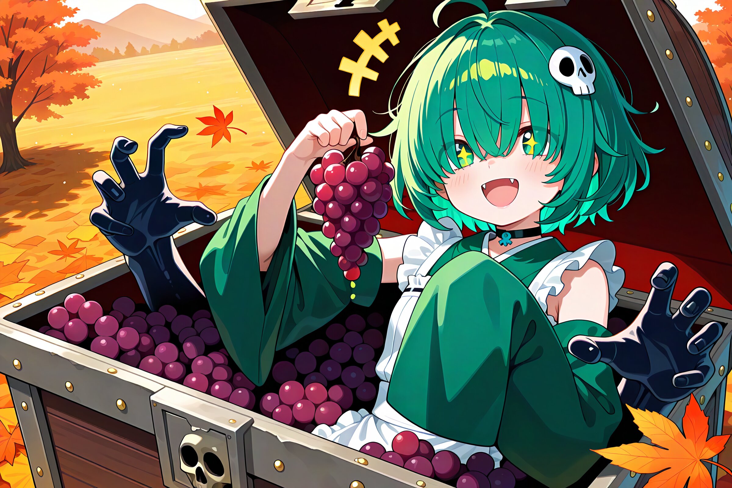 1 little girl, solo, diagonal angle, masterpiece, best quality, amazing quality, very aesthetic, cobalt green hair, short hair, messy hair, (hair over eyes:1.2), green eyes, demon fangs, +_+, open mouth, smile, cheerful, +++, notice lines, choker, green wa maid outfit, (oversized sleeves:1.2), detached sleeves, (floating black ghosty hands:1.2), skull hair ornament, in mimic chest, holding grapes, autumn,