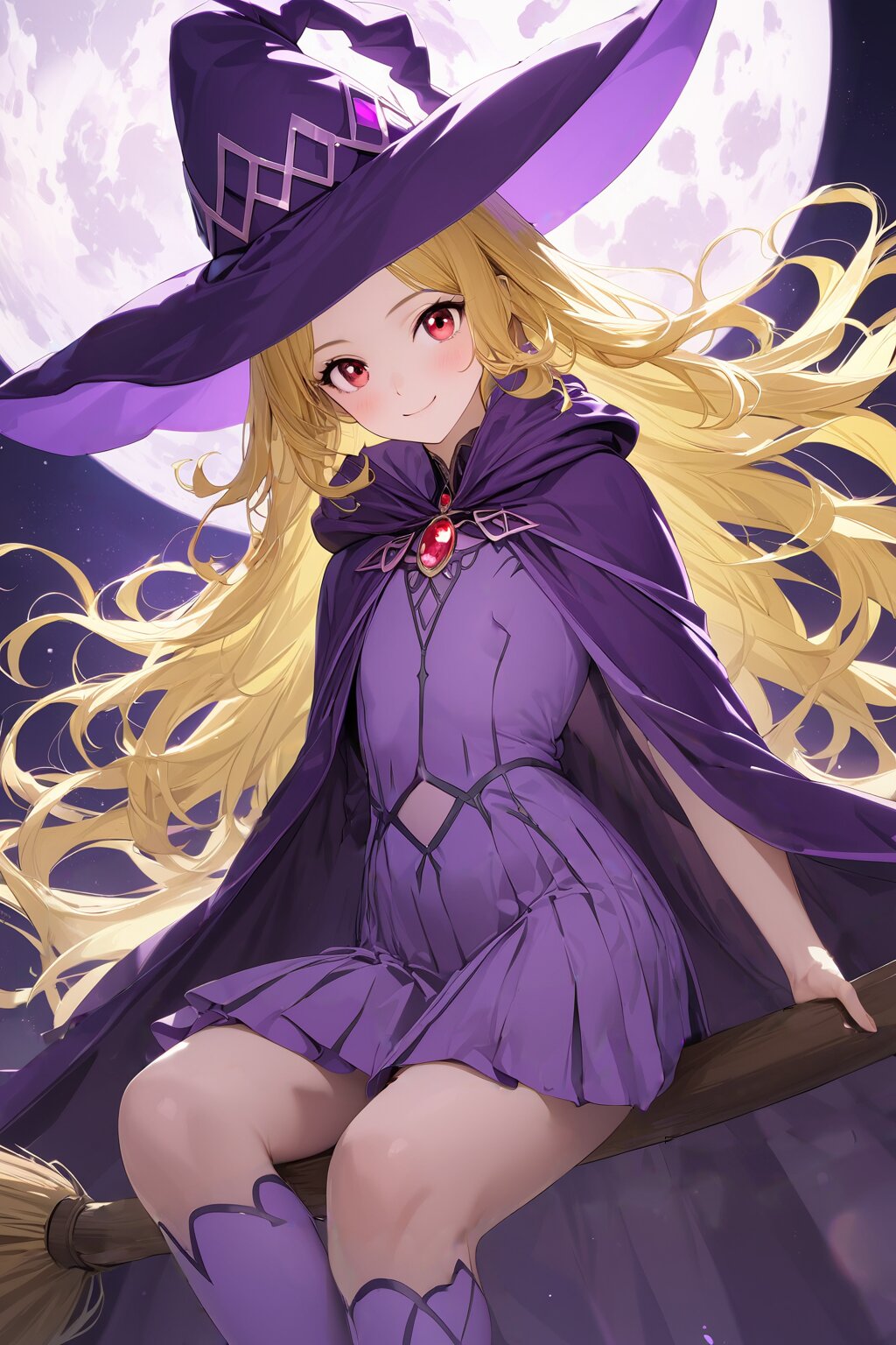 1girl, night:1.3,purple light,(purple full moon),(purple theme), (tall:1.3),(young),slender, flat chest, (lemon yellow hair),absurdly long hair,(center parted bangs),(hair intakes:1.3),wavy hair,sideburns, (garnet red eyes),Jig eyes,(tsurime),one eye closed, blush,sneer,smile, purple witch robe,purple witch hat,purple witch cloak,purple kneehighs, broom_riding,flying, cowboy shot,dynamic angle,looking at viewer,from side:0.8, ((best quality)),((very high resolution)),full color,((ultra detailed)),extremely detailed CG,super fine illustration, perfect anatomy,perfect hands,super detailed skin, (beautiful eyes,detailed eyes,clear eyes,perfect eyes),high-quality face,extremely detailed face, manga style,hyperrealistic,