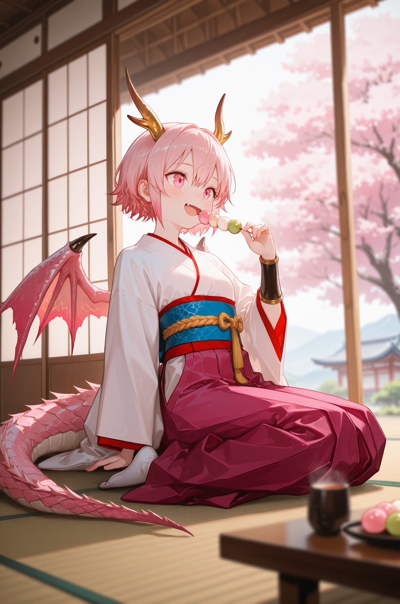 春の和室でお団子を楽しむ桃香ちゃんのファンアートを生成してみました!(*´▽`*)