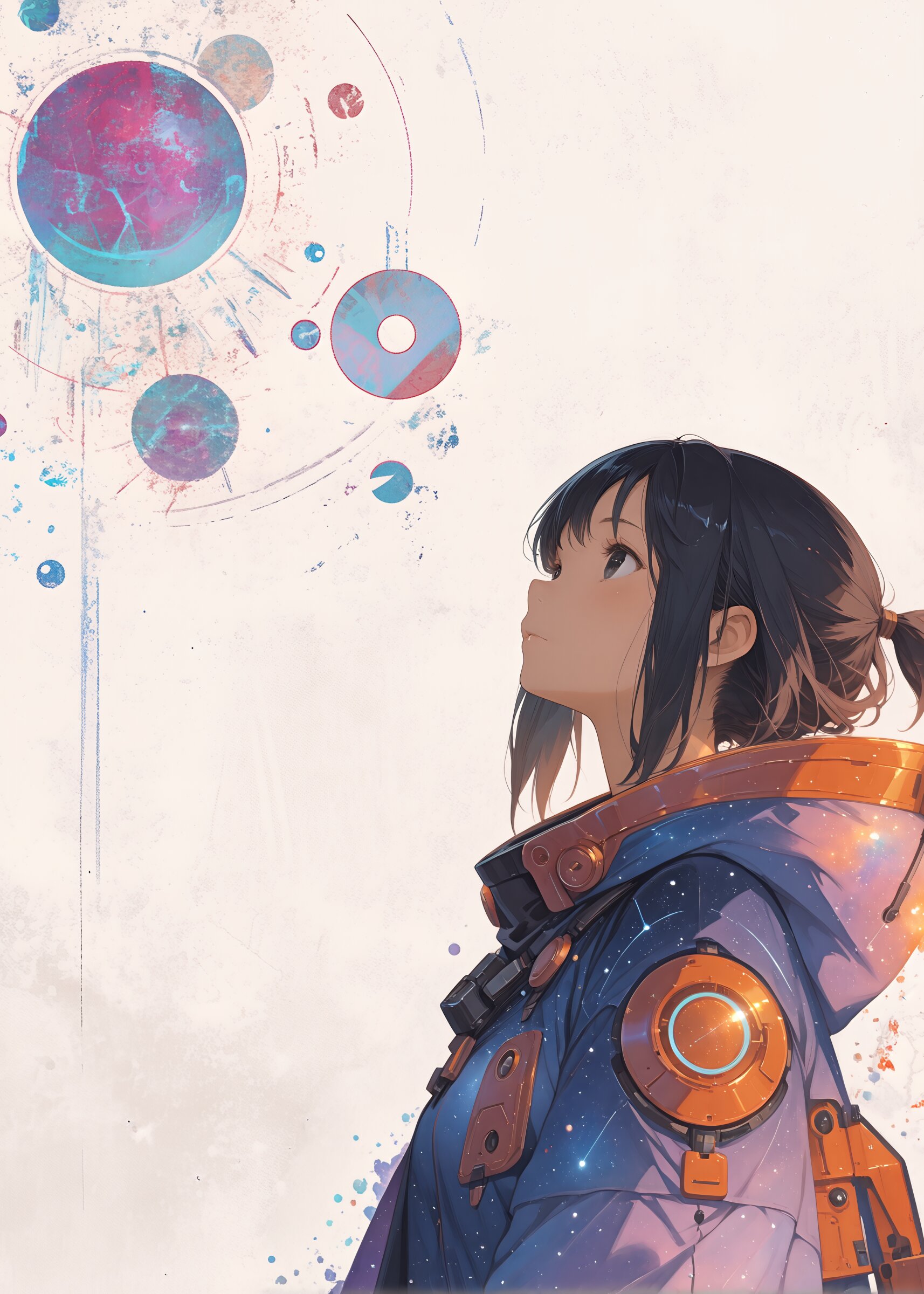 Best quality, Masterpieces, simple background, negative space, anime-style illustration, fine detail, 1girl, (young girl), cute face and eyes, black hair, clear black eyes, single short ponytail hair, big breasts, Vigorous, lively, and spontaneous personality, floating in outer space, surrounded by glowing purple nebula and galaxies, shimmering stardust, planets and cosmic rings in the distance, wearing a mystical cosmic outfit, serene and dreamy atmosphere, universe as a background, cinematic angle, cinemagraph style, Space Opera, futurism, Techno-Organic World