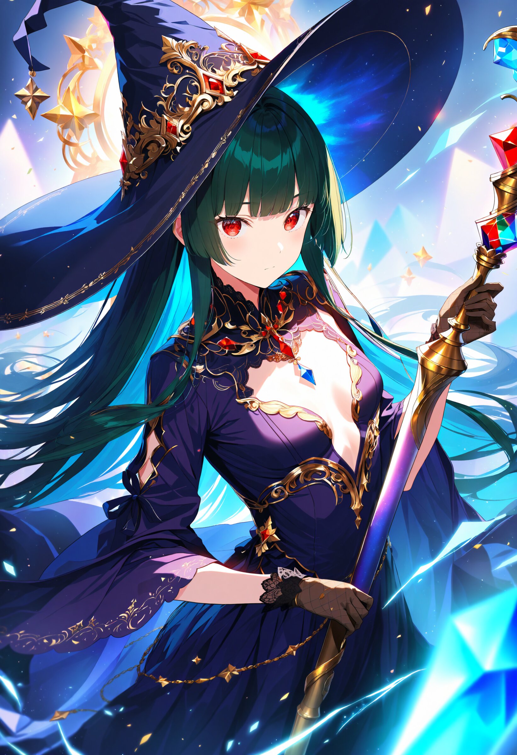 (masterpiece, best quality, ultra-detailed, high resolution, perfect anatomy, beautiful detailed eyes, beautiful detailed face),girl,dark green hair, long hair, hime cut, red eyes, small breasts, long flowing purple witch dress, wide-brimmed hat with ribbon, lace gloves, glowing magical aura, ornate staff with crystal, elegant and mysterious design
