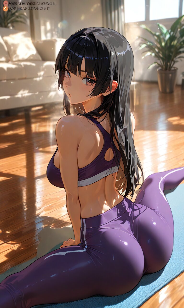 (best quality),(masterpiece),(ultra detailed),1 lady, long hair, black hairblunt bangs, cool, , sports bra, leggings, from behind, morning, , living room,<lora:side-sitting-split-illustriousxl-lora-nochekaiser:1>, side sitting split, sitting split, split, flexible, stretching, on floor, spread legs, yoga pants, sports bra, from behind, ass, looking back, looking at viewer,