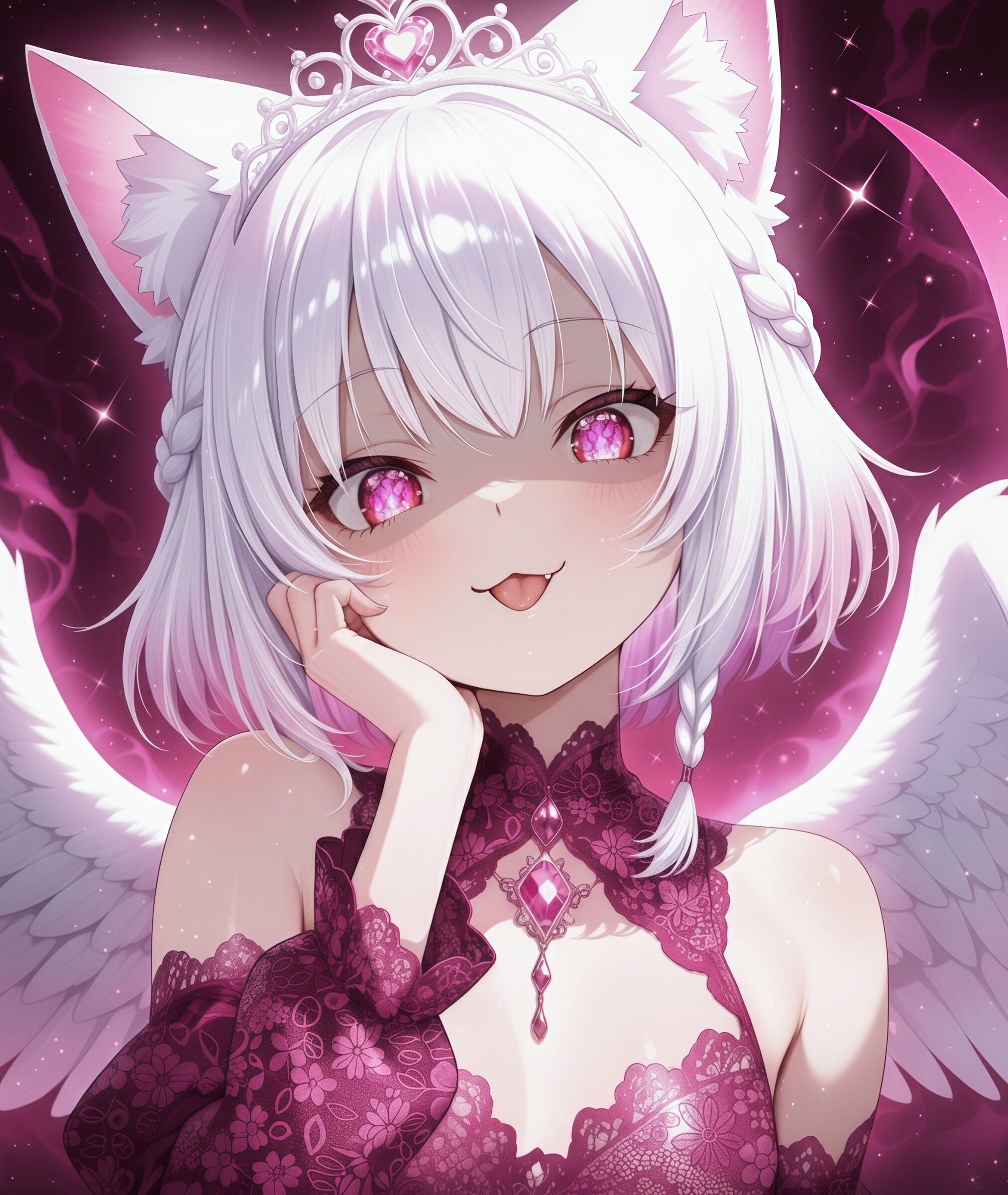 (masterpiece, best quality, ultra-detailed, intricate details, anime style, 8k illustration, shine colorful, vibrant colors), 1girl, angel, cat ears, close-up portrait, highly detailed face, long silver-white hair, intricate braid hairstyle, loose strands, playful mischievous expression, :3, ornate tiara with glowing morganite gemstones, (mysterious pink glow radiating from the gems:1.4), glowing pink eyes, radiant jewel-like pupils, shaded face, shadow covering the upper half of her face, insane and maniacal smile, looking at viewer, upward gaze, (one hand touching cheek), hand on own cheek, tongue, dark pink elegant dress, delicate lace and flowing fabric, subtle feathered angel wings softly visible behind, pink aura glowing around, gemstone light reflecting on skin, dreamy dark-pink background with faint magical sparkles, mystical, alluring, and enchanting atmosphere, dutch angle, diagonal angle,