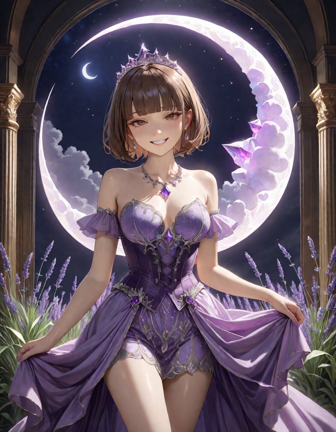 ahoge,brown hair,short hair,straight hair,blunt bangs,hime cut,delicate face,detailed face,brown eyes,detailed skin,masterpiece,absurdres,best quality,insanely detailed,beautiful,8k,photorealistic,intricate details,mysterious seductive smile,(lavender dress with deep purple amethyst gemstones adorning the bodice:1.3),(fitted corset with shimmering silver thread and tiny amethyst crystals embedded into the design:1.1),lavenderhigh heels with amethyst gemstone,(amethyst tiara with a crescent moon centerpiece:1.1),(silver necklace with an amethyst moon pendant that glows faintly:1.1),shining lights,dynamic lighting,full body shot,mystical atmosphere,fairy academia,hyperrealistic photo,cheerful,grinning,looking at viewer,shiny hair,princess