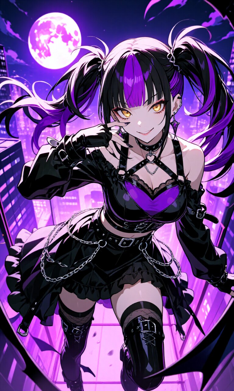 紫の月光に包まれた都市の中で、金色の鋭い瞳が異彩を放っていますね🌑