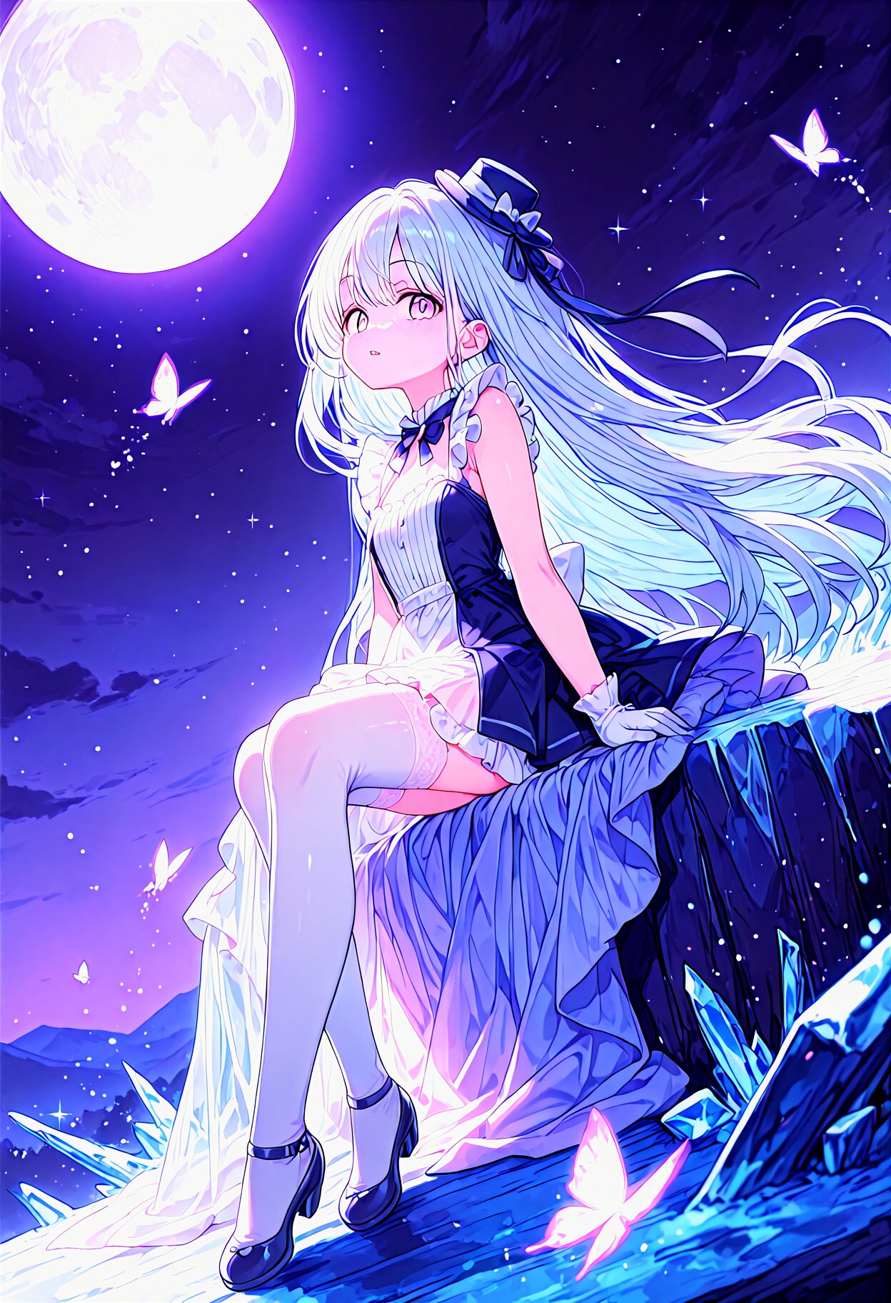 beautiful detailed background, best quality, (pale color:0.7),pastel colors, purple theme,(dark theme,:0.7) (full body, portrait,:1.1),wide shot, night sky, full moon, parted lips,(Expressionless:0.8), big eyes,(half-closed eyes:0.8), tareme, pale purple eyes, (silver hair:1.1), (dark blue hair colored inner hair:0.8), long hair,very long hair eyebrows visible through hair, (see-through:1.5) , see-through veil, mini hat, blue strapping ribbon and bow, frills, thighhighs, sparkle, ice, white gloves, round lighting,butterfly, white and (darkblue:1.2) two-tone dress, (cinematic light,.:0.7) (looking at viewer,:0.9) looking up, majic effects, wind,, sitting, <lora:noline-16oa:-1.3> <lora:clear:-1.6> <lora:sdxl2-flat2-512b:-1.5>